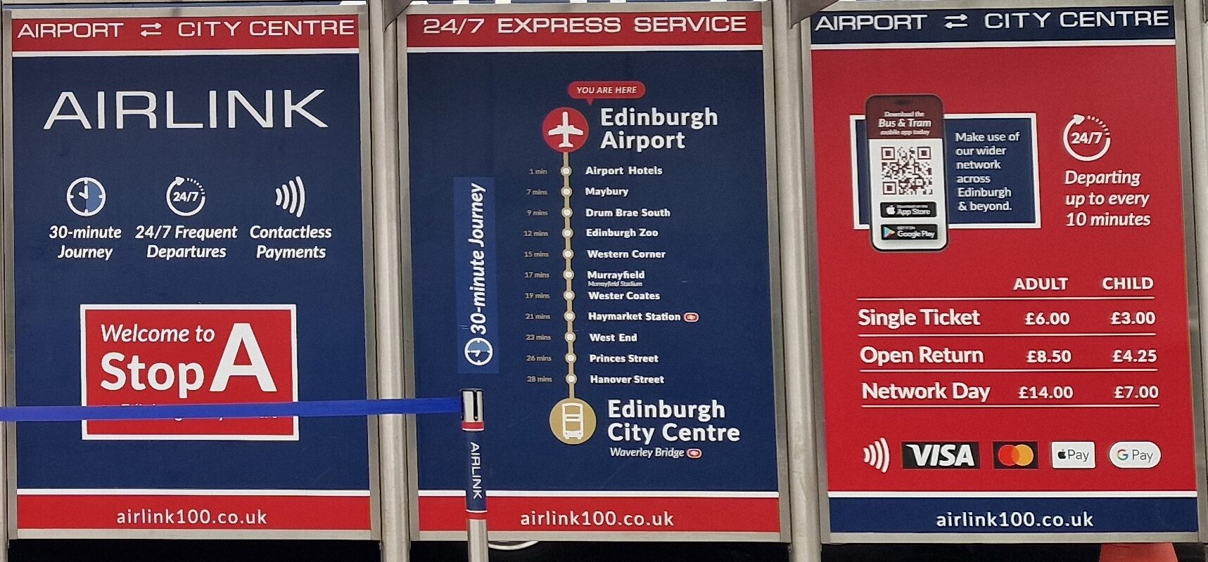 El Airlink 100 es una de las opciones más populares para ir del aeropuerto de Edimburgo al centro. Funciona las 24 horas del día, los 7 días de la semana y tarda aproximadamente 30 minutos, dependiendo del tráfico.