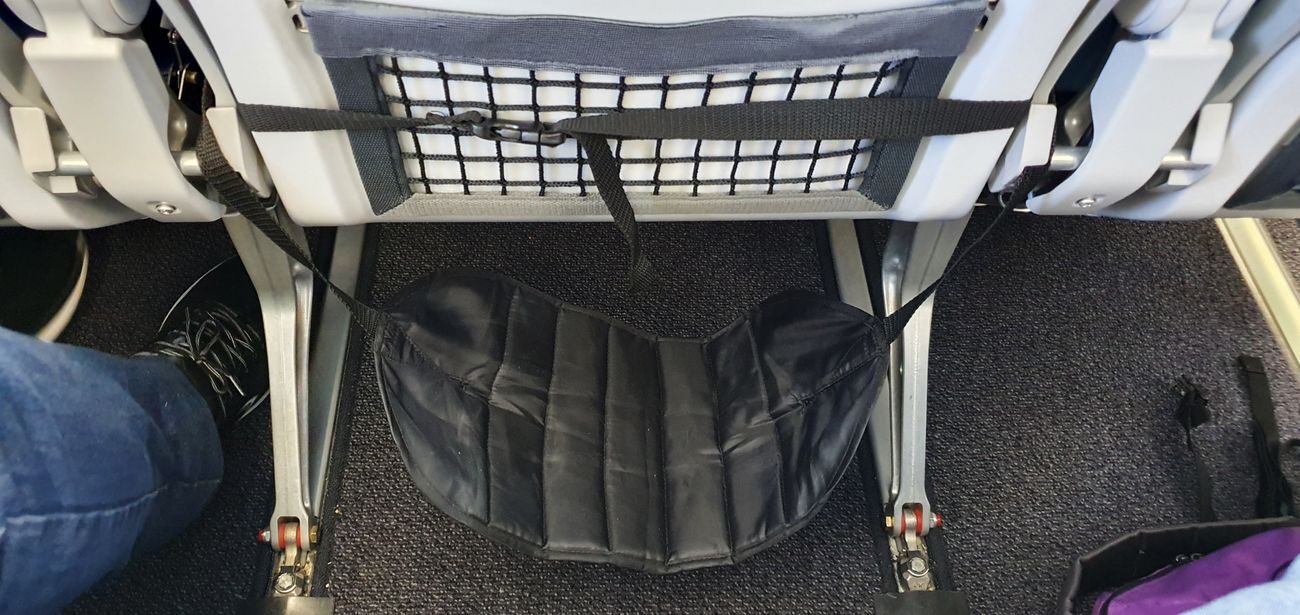 En el caso de vuelos por España no tiene sentido pagar por unos asientos u otros porque son todos prácticamente iguales y en ninguno se puede colocar la maleta en los pies. Pero como nunca voy sin un plan B, siempre viajo con mi reposapiés plegable. Se cuelga de la mesita del asiento delantero y por lo menos me permite llevar las piernas elevadas (aunque no estiradas), cosa que favorece en parte mi maltrecha circulación.