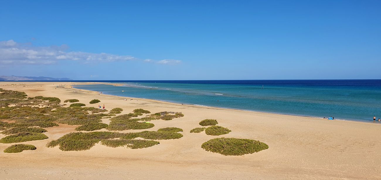 Las vistas tanto de frente como a nuestras espaldas son absolutamente impresionantes. Por un lado, enormes dunas de arena; por el otro, la montañosa costa majorera a lo lejos mientras a nuestros pies una deliciosa agua turquesa empieza a dejar a la vista las famosas lenguas de arena de la playa de Sotavento, pese a que aún faltan más de tres horas para que se complete la bajamar.