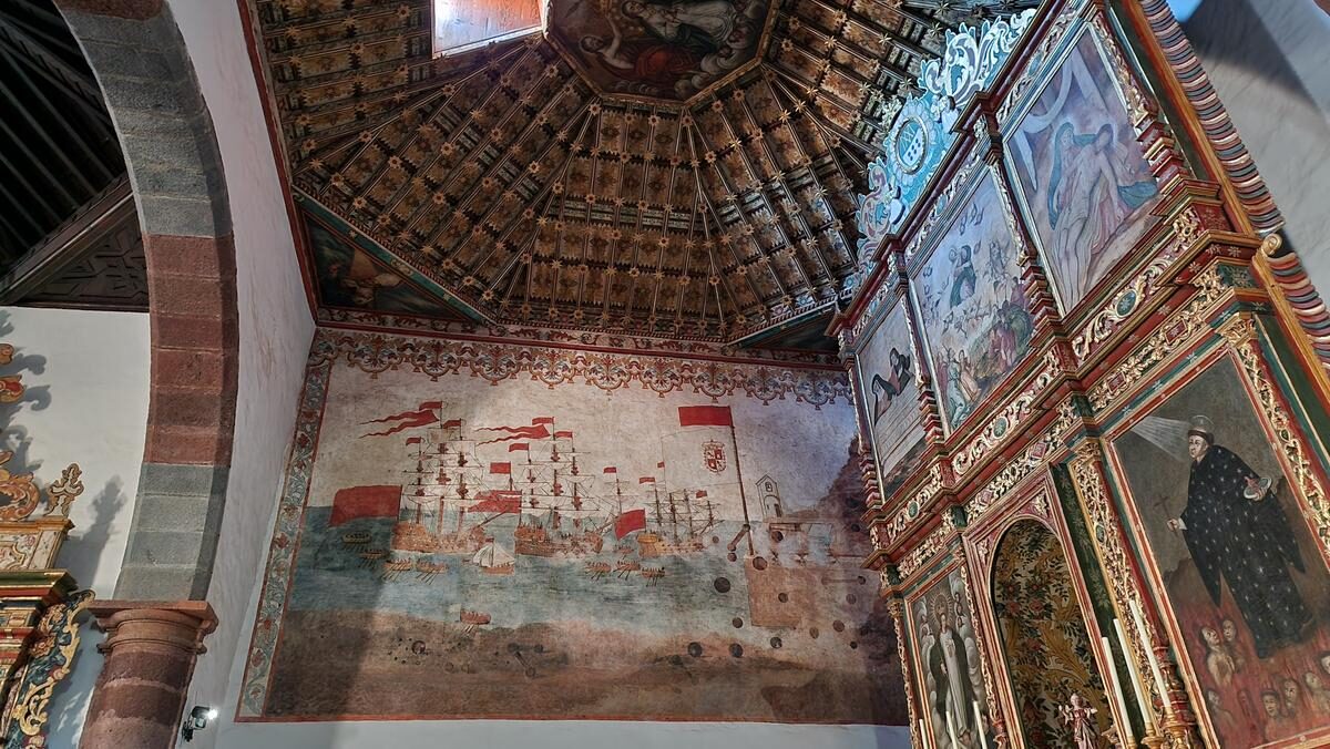 • La iglesia de la Asunción con su llamativo fresco que refleja el intento de invasión en 1743 por parte del almirante inglés Charles Windhan.