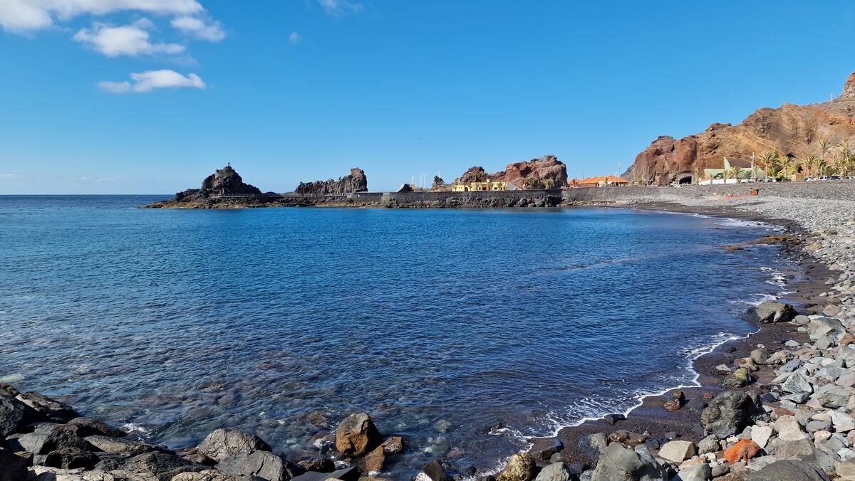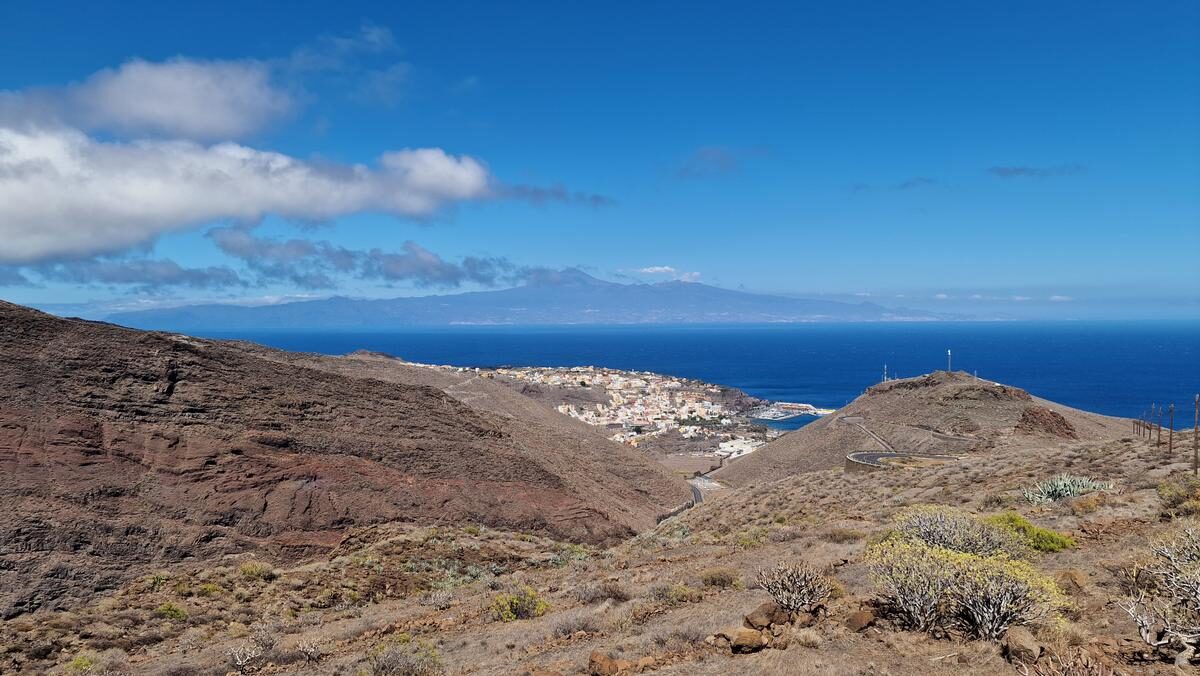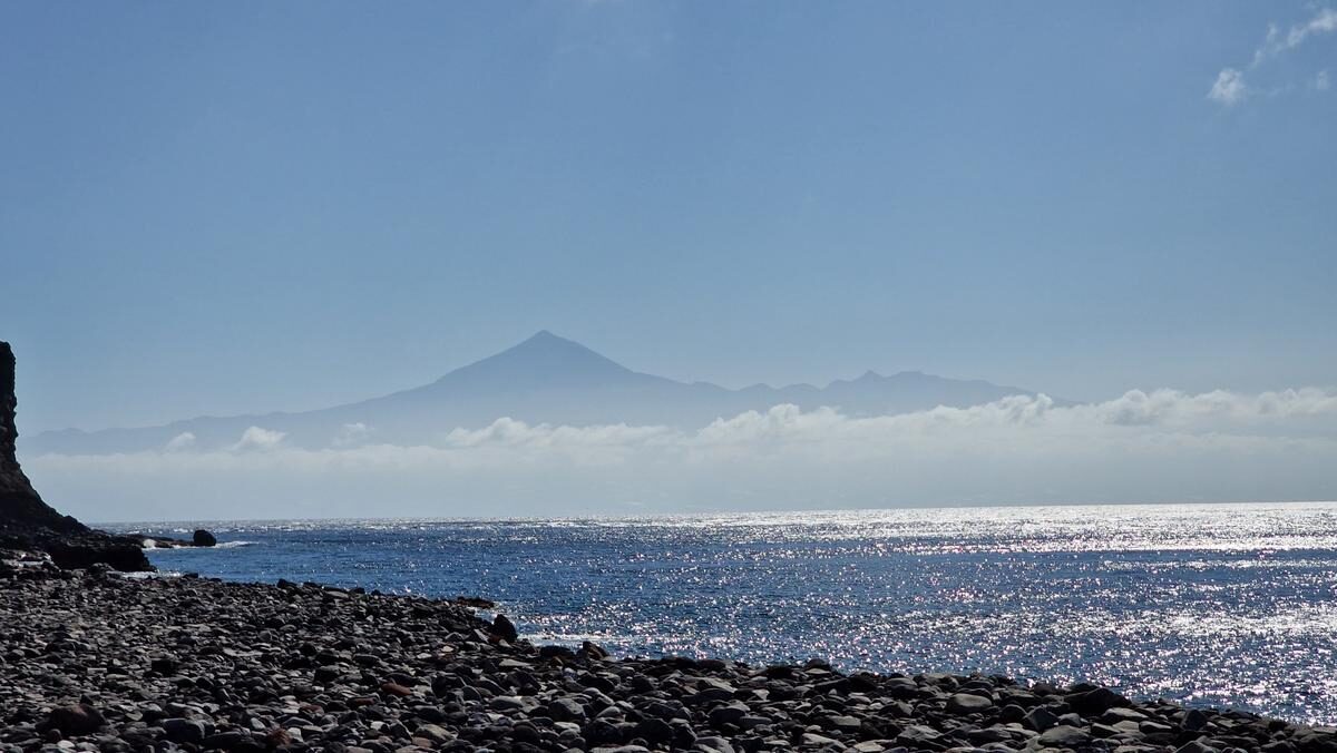 Nos acercamos hasta la playa de la Cueva desde donde obtenemos por primera vez una panorámica de Tenerife con el Teide destacando sobre las nubes. Lástima que por el momento esté cubierto por bruma y las fotos no salgan muy nítidas… Por suerte sé que tendremos más oportunidades, por lo que no me preocupa.