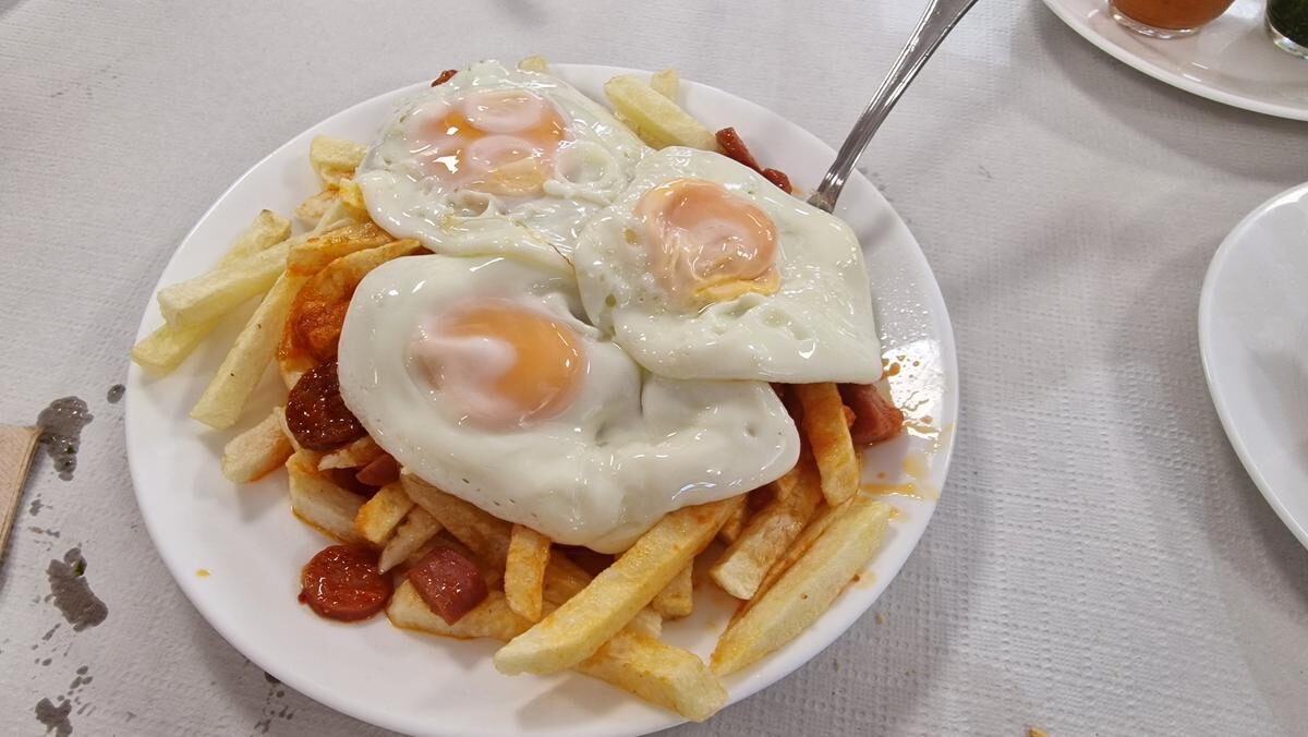 Suerte que el camarero nos insistió hasta en tres ocasiones en que pidiéramos media ración de huevos, porque son muy abundantes. Es el plato que menos nos ha llamado la atención puesto que está bastante grasiento, cosa que no se aprecia en la foto ya que toda la grasa queda debajo de las patatas.