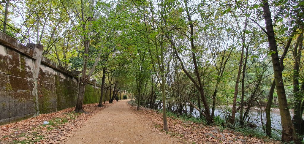 Iniciamos la ruta a las 10.20 horas. Se trata de un sendero llano de arenilla / tierra protegido por árboles, paralelo al río Sil. Es un camino tranquilo, sin apenas gente y muy bonito con los árboles empezando a cambiar a los tonos ocres típicos del otoño.