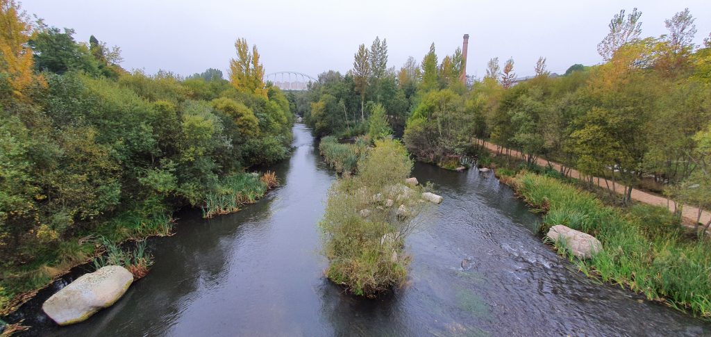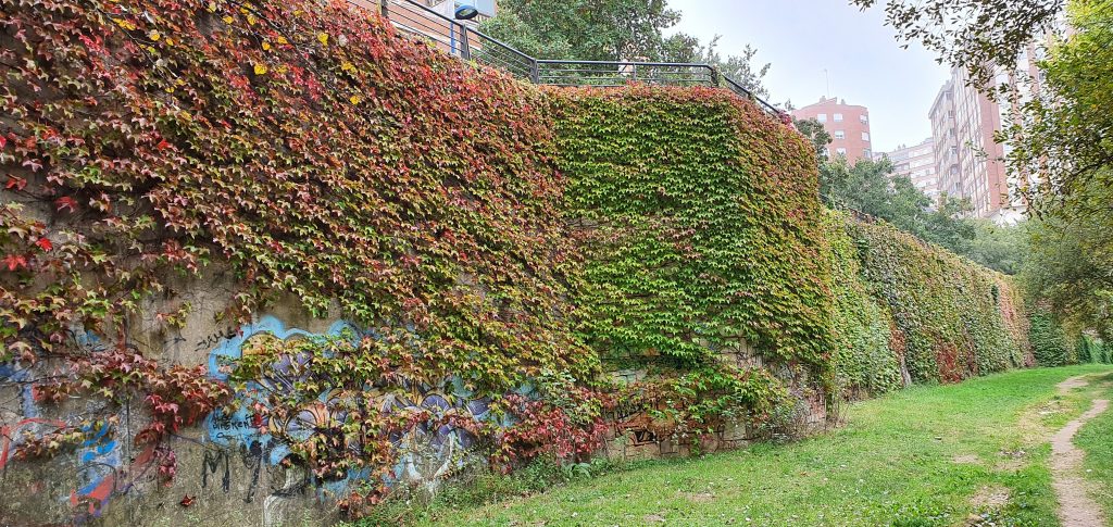 Decidimos poner rumbo de nuevo al Puente Cubelos (por la otra orilla, la que aún no conocemos), ya que si giramos a mano izquierda después de cruzar el puente haríamos gran parte de la ruta que habíamos organizado con el itinerario de Wikiloc pero luego la vuelta tendría que ser por ese mismo sitio y las rutas lineales no son de nuestras favoritas… Así que como digo decidimos volver al Puente Cubelos pero por la otra orilla del río a ver si el sendero también es bonito. “Nuestro gozo en un pozo” cuando lo que atravesamos es una barriada gitana que hace que guardemos nuestros móviles en los bolsos más profundos y no los saquemos casi hasta finalizar la ruta, donde sacamos un par de fotos a unas paredes recubiertas de vegetación, muy chulas, pero que desmerecen un poco por los grafitis que las acompañan…