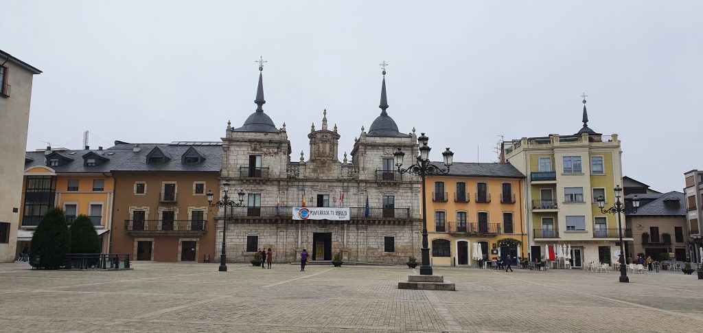 Tardamos solo 40 minutos en llegar a Ponferrada. Esta vez dejamos el coche en un parking grande y gratuito que ya traía mirado desde casa y que está a un minuto andando de la plaza del ayuntamiento.