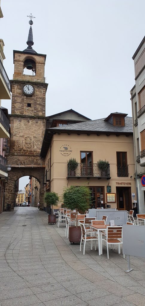 A las 11.40 horas, 1 hora 20 minutos después de haber empezado y justo antes del Puente Cubelos encontramos una escaleras a mano izquierda por las que llegamos en cinco minutos a la Plaza Mayor, ubicada en el casco antiguo de Ponferrada. Echamos un ojo a la plaza, que apenas tiene ambiente, y pasamos bajo la Torre del Reloj: “construida sobre el Arco de la Eras (única puerta que se conserva de la muralla medieval), la Torre del Reloj es el emblema de Ponferrada. Este arco comunica las dos plazas más importantes del casco histórico (la Plaza Mayor y la Plaza Virgen de la Encina)”.
