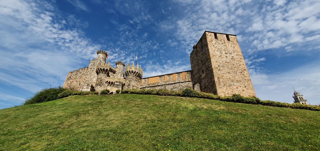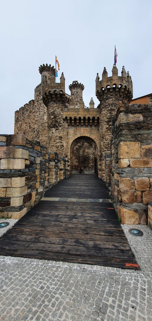Atravesamos la Plaza Virgen de la Encina con su Basílica de Nuestra Señora de la Encina y llegamos al Castillo de los Templarios: “el conjunto fortificado más imponente del norte peninsular y uno de los enclaves templarios más importantes de Europa. Con una extensión superior a los 8.000 m², el castillo, Bien de Interés Cultural declarado Monumento Nacional Artístico en 1924 está formado por diversos edificios, dependencias, zonas de exposición y tienda, la Biblioteca Templaria y Centro de Estudios Históricos, la exposición bibliográfica de carácter permanente Templum Libri y amplios espacios al aire libre que se pueden recorrer siguiendo los itinerarios señalizados. Cuando en 1178 Ponferrada pasa a depender de la Orden del Temple por donación de los Reyes Leoneses, los templarios se encuentran una pequeña fortaleza que fue en su origen castro y posteriormente ciudadela romana. Ellos la amplían y mejoran como defensa del Camino de Santiago, estando acabada en 1282. El Castillo que hoy conocemos es el resultado de una larga serie de ampliaciones”.