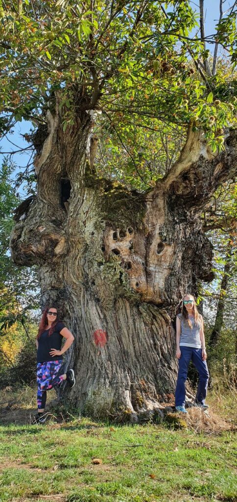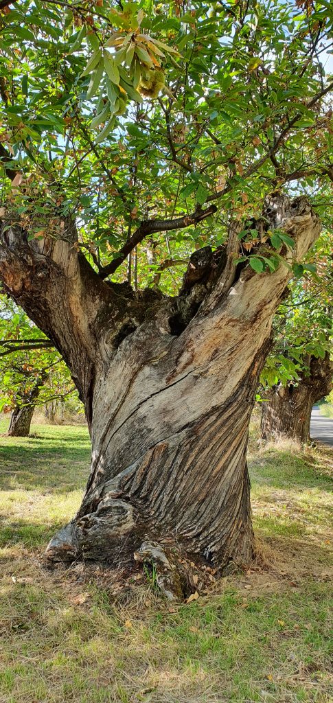 En el desvío de la carretera nacional por la que venimos hacia LE – 6228 nos encontramos con una zona en la que tenemos que parar sí o sí… Se trata de unas decenas de metros en las que en el margen izquierdo hay un montón de castaños centenarios con unos troncos absolutamente espectaculares, ¡¡¡enormes!!! Donde solo se escucha el sonido de las castañas cayendo sin parar de las ramas. ¡¡¡¡Me encanta este lugar!!!! ¡¡¡¡Esos árboles son una pasada!!!!