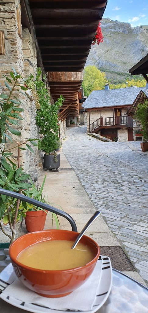El pueblito es pequeño y se recorre en nada, pero es tan encantador que desandamos camino y aprovechamos para sacar un montón de fotos preciosas… Me he enamorado de este lugar… No queremos irnos muy tarde para que no se nos haga de noche por esa carretera de montaña, pero aún vamos bien de tiempo por lo que decidimos tomarnos un caldito de fideos en el bar – restaurante Aromas del Oza. ¡¡¡Las vistas desde aquí es que me encantan!!! No puedo parar de contemplarlas… ¡Qué sitio tan tan bonito! ¡De verdad! ¡Super recomendable su visita! El caldo es enorme y delicioso por solo 4€ cada uno.