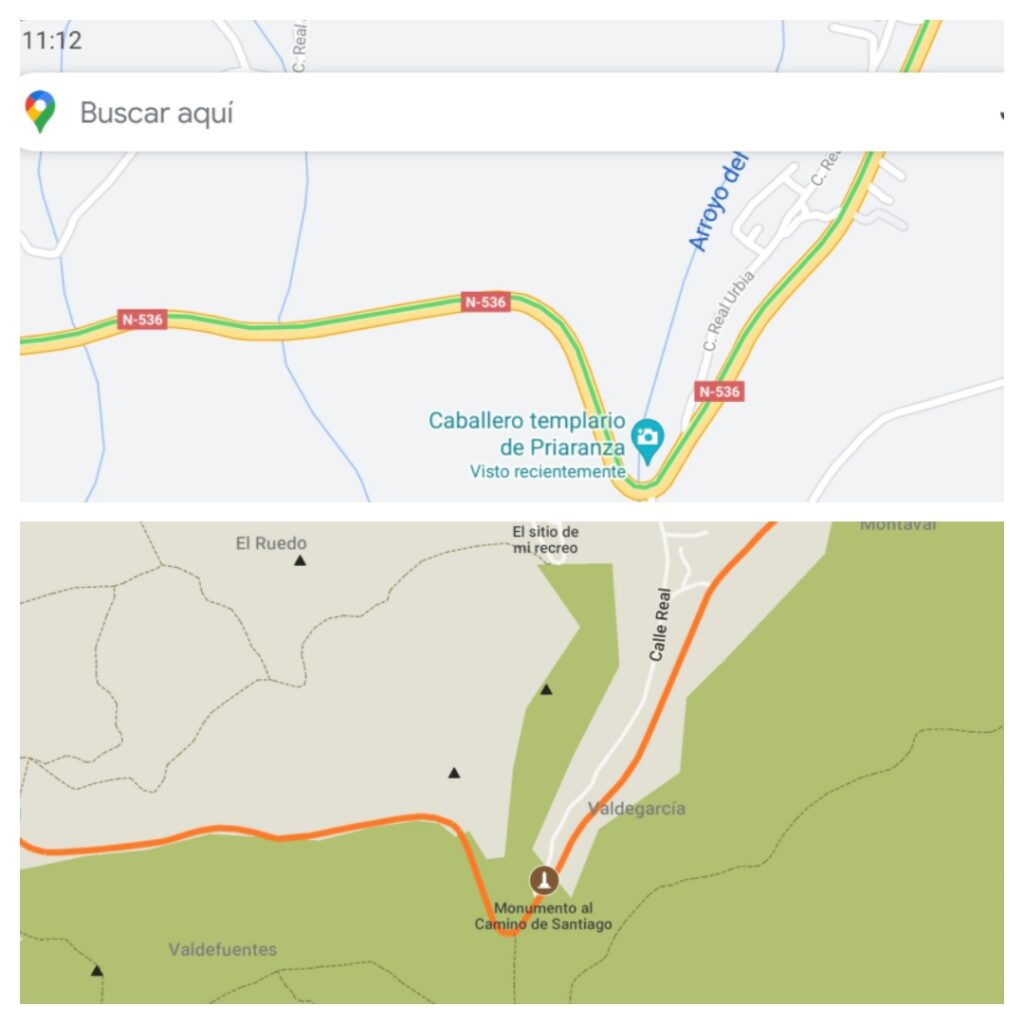 ¿Próximo destino? La estatua del Caballero Templario de Priaranza según Google o el Monumento al Camino de Santiago según la app Maps.me.