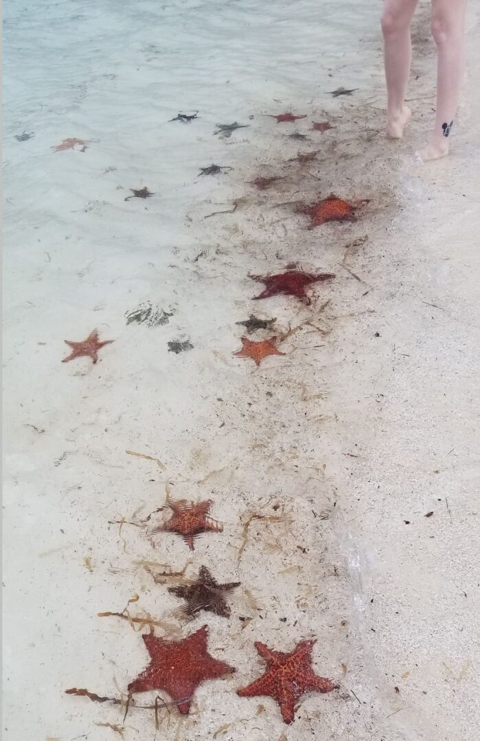 Mi madre se pone a comer pero yo necesito comprobar si voy a ver por fin mis estrellas de mar. Voy caminando por la orilla hasta que me encuentro la primera estrella y vibro de gozo, y eso que es pequeñita y de color marrón. Sigo por la orilla y me encuentro otras dos estrellas marrones y una roja enorme. Me siento super feliz.