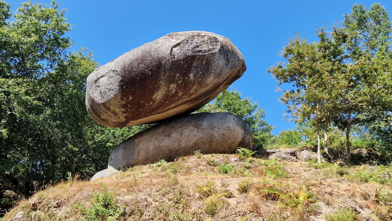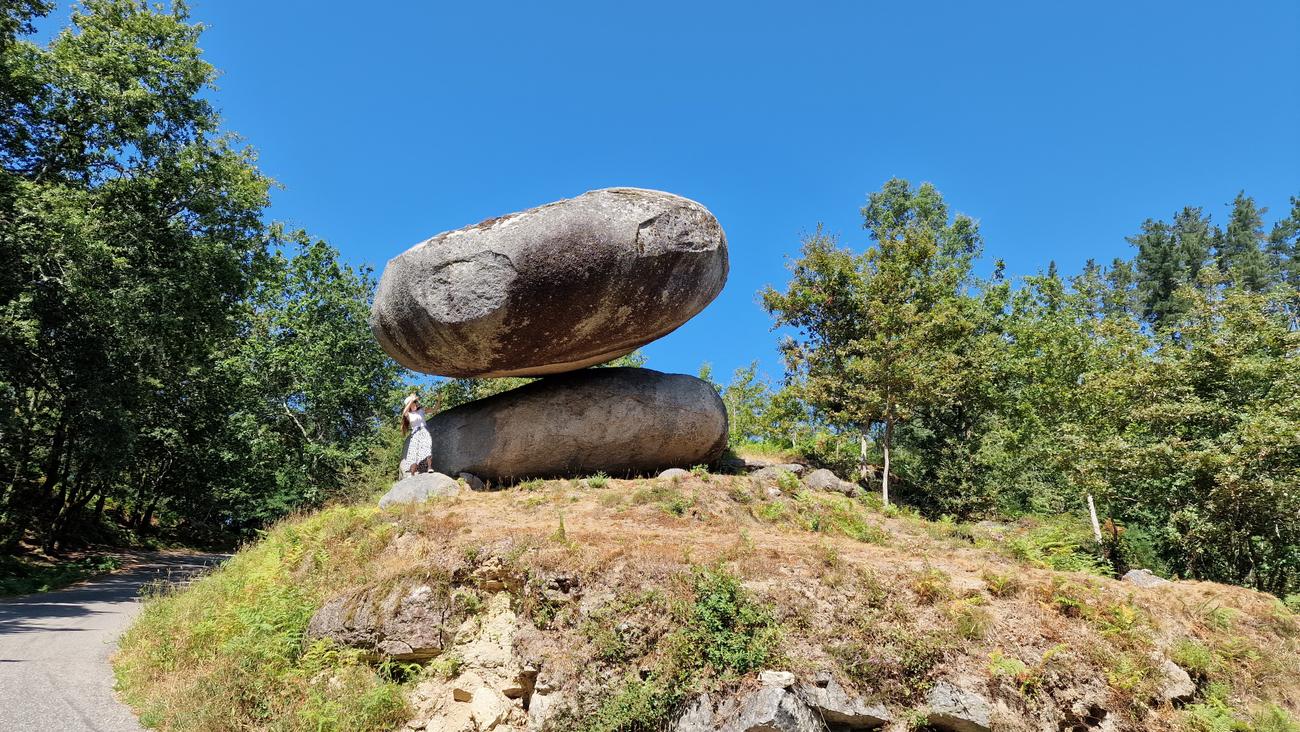 Tardamos una hora veinte minutos en aparcar junto a la iglesia de Arcos. Venimos a visitar el penedo do equilibrio. “Son dos enormes piedras cuyo equilibrio desafía a la gravedad, ya que una reposa sobre la otra unidas por un punto minúsculo. Cuenta la leyenda que la piedra se mueve y que antiguamente, para comprobarlo, bajo la enorme mole se colocaba una botella apretada, la cual aparecía rota a los pocos días“.