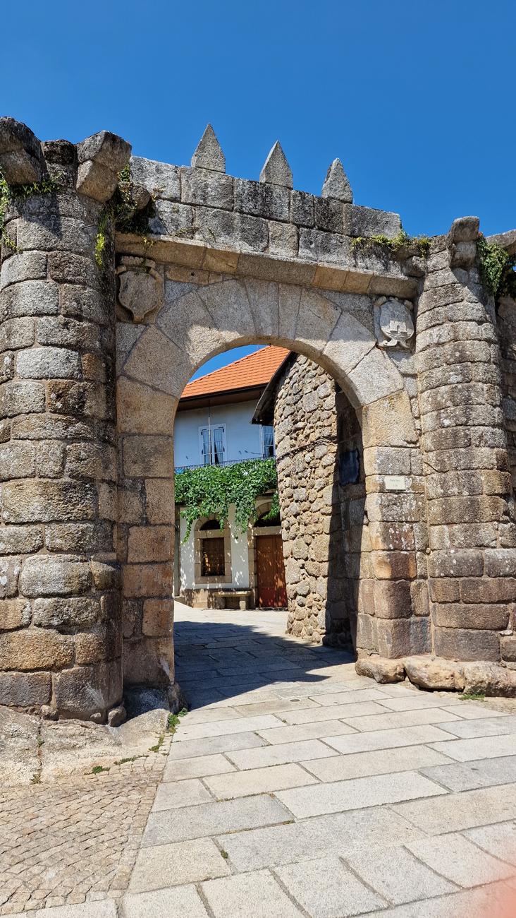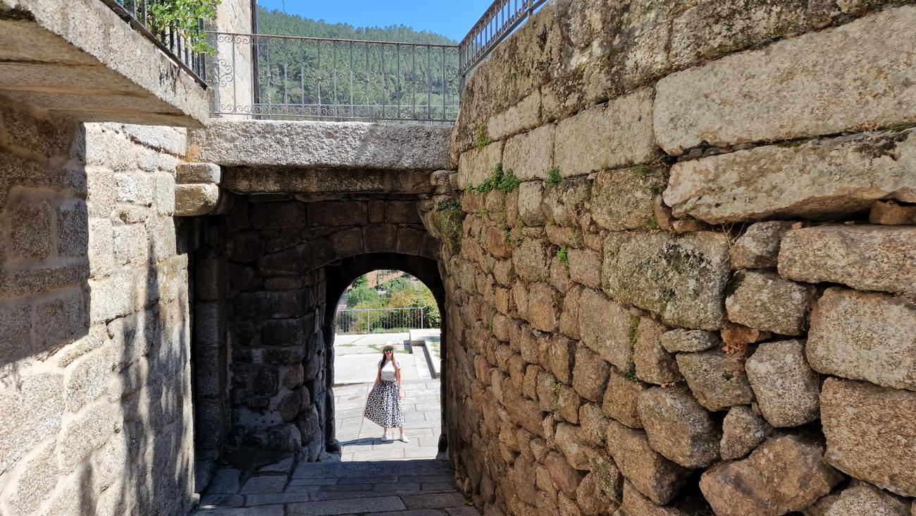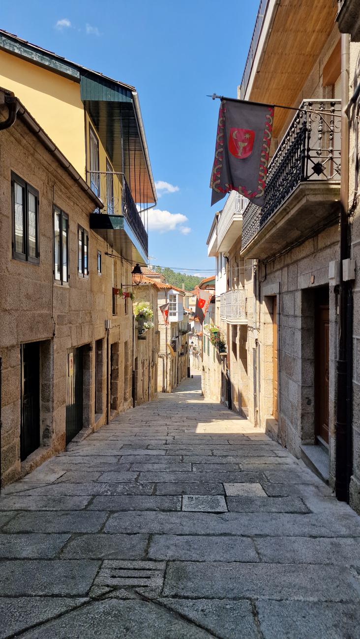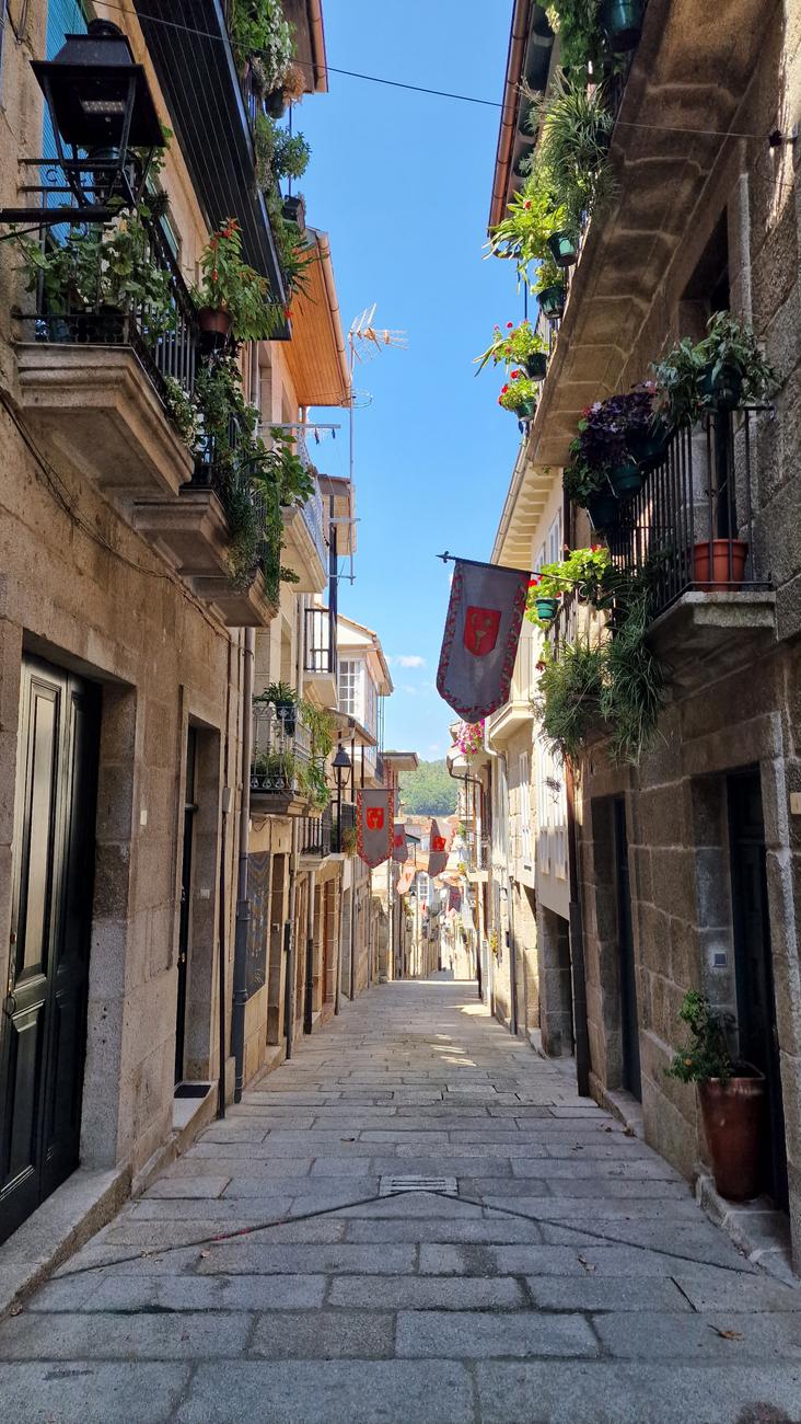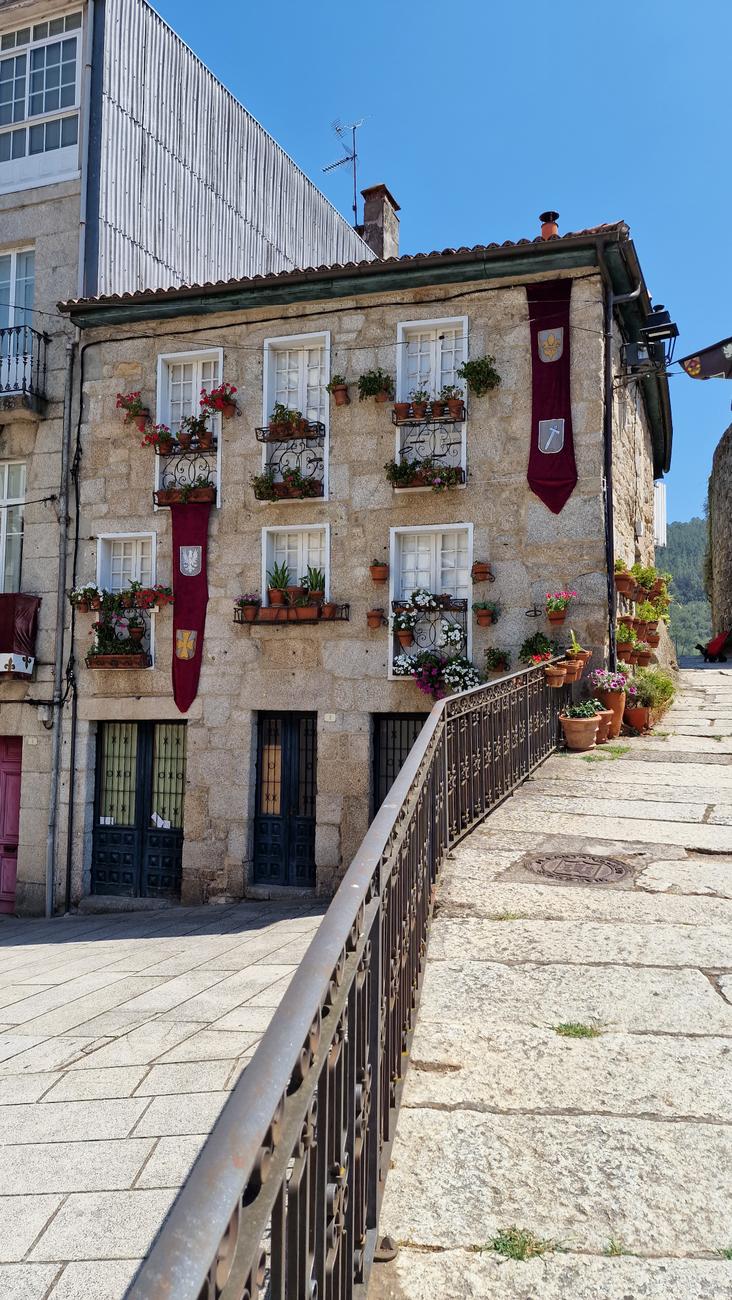 Nos asomamos por la puerta falsa o postigo, una de las tres que se conservan de la antigua muralla que daba acceso al río Avia. Había leído que “desde aquí hay una bonita vista panorámica sobre el río, con los característicos bancales, donde todavía se cultiva la vid de la que se obtiene el afamado vino del Ribeiro“.