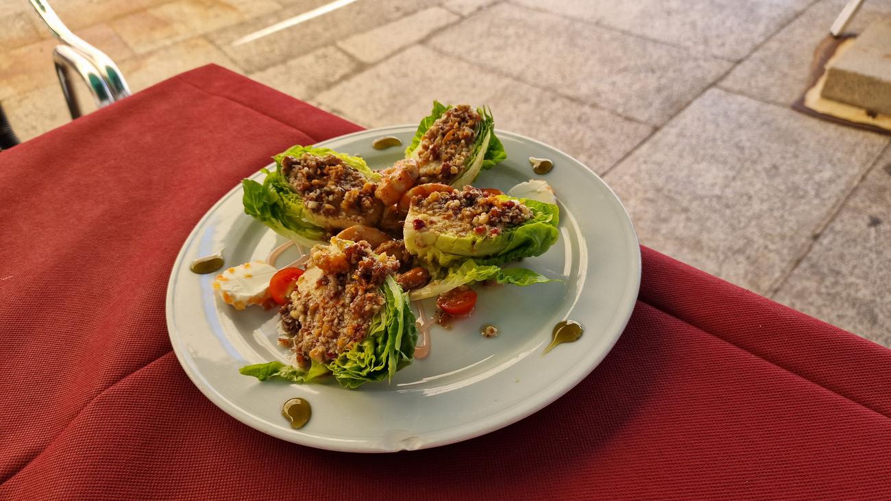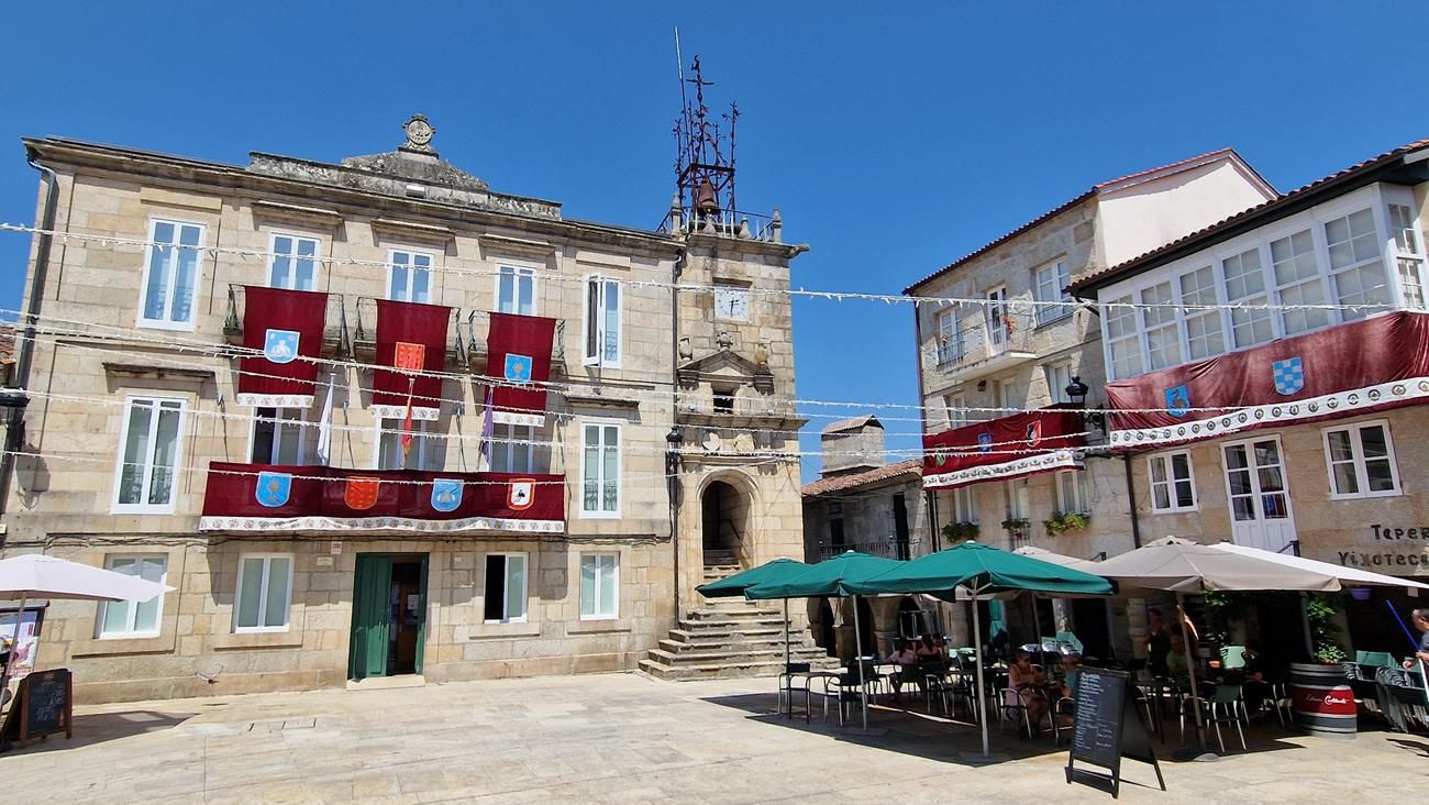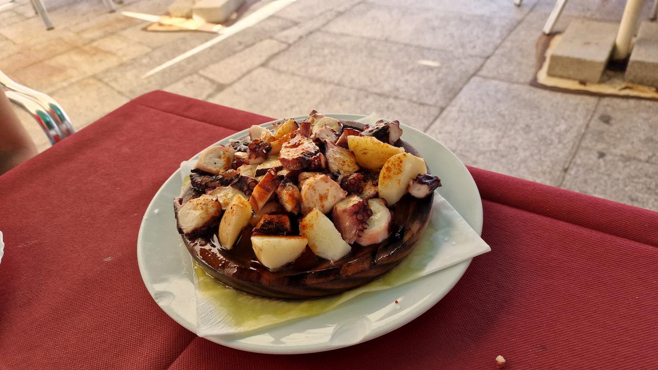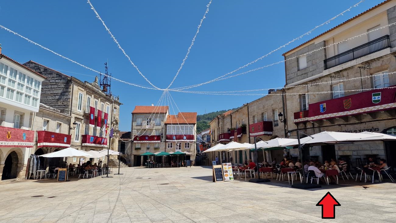 Hace un calor terrible (33º a la sombra) y estamos muertas de hambre, por lo que lo primero que hacemos es buscar un sitio donde comer y refrescarnos. Nos acercamos hasta A Comanda, restaurante que traía recomendado, pero está lleno y solo admiten gente con reserva. Por suerte encontramos hueco en la Plaza Mayor, en Ribeiro e Xamón. No tienen una carta muy amplia pero sí tienen mesa en la terraza a la sombra y con eso nos vale. Además las vistas de la Plaza Mayor y del ayuntamiento con la torre del reloj de fondo son una maravilla.