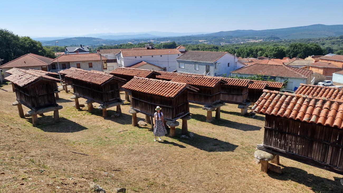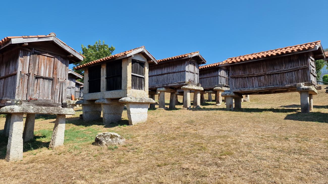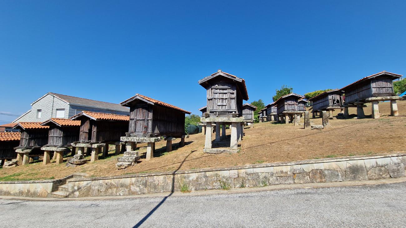 “En La Merca existe un conjunto de treinta y cuatro hórreos en un lugar conocido como O Campo da Feira. Hórreo, canastro, cabana, canizo, cabaceiro o cabazo, todas estas palabras son utilizadas en Galicia para denominar un tipo de construcción popular que acompañó en su labor a lo largo de la historia a las gentes del medio rural gallego. La concentración de hórreos de La Merca es la más grande de Galicia y una de las más importantes de Europa. Estos hórreos, cuyo origen se remonta a principios del siglo XX, fueron trasladados a su ubicación actual en los años setenta. Llegaron a rehabilitarse todos menos uno, del que solo quedan los soportes“.