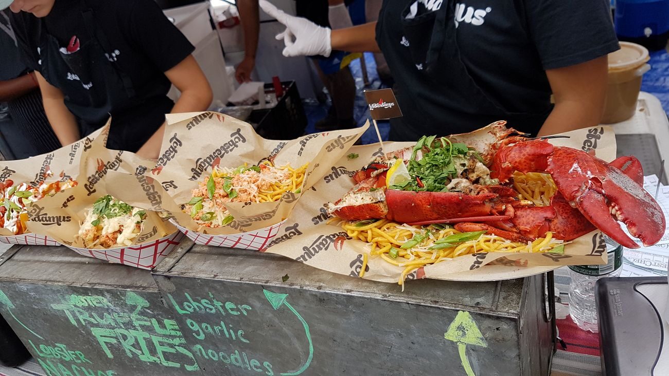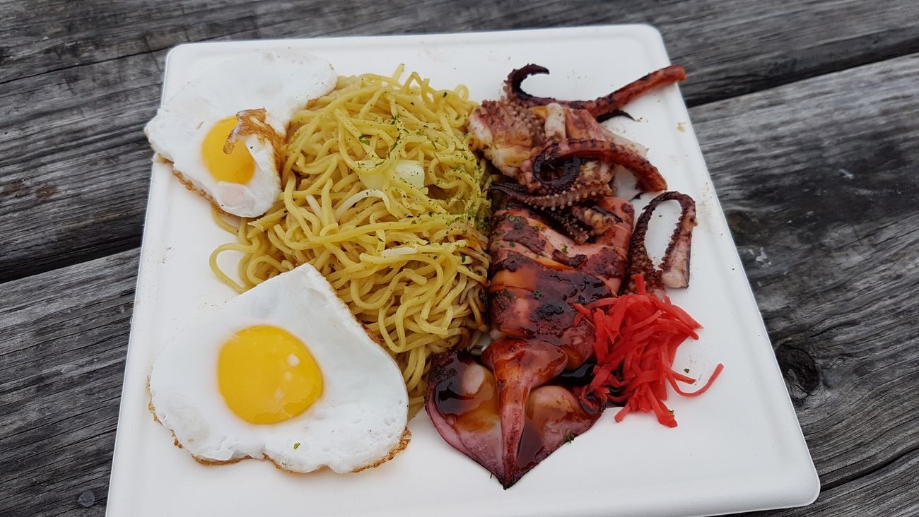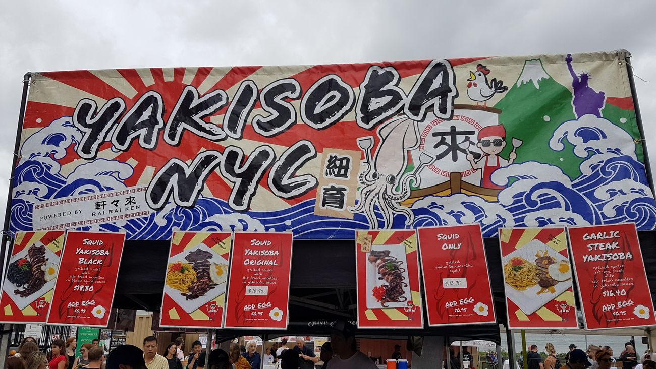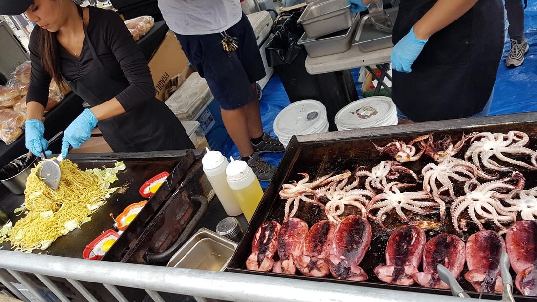 Nos decidimos por el puesto de Yakisoba NYC y pedimos para compartir un “squid yakisoba original” con un huevo extra por 19,95$. Se puede pagar con tarjeta. Hay bancos y mesas por la zona para comer. El plato está delicioso y abundante. Los tentáculos del calamar quedaron un poco duros pero el resto está buenísimo.