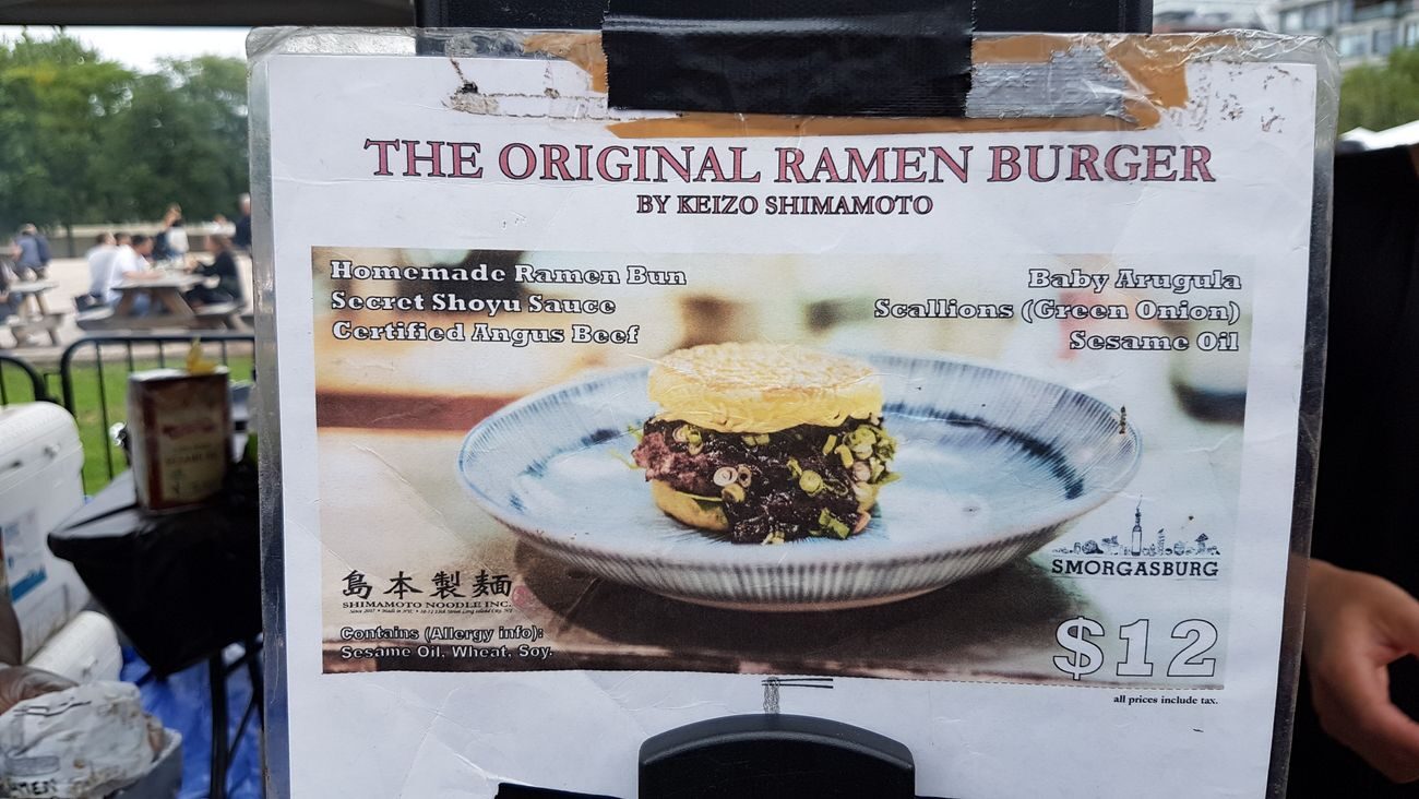 Queríamos probar también “The original ramen burger”, uno de los platos más famosos del mercado. Se trata de una hamburguesa servida entre dos “panes” que en realidad son fideos, por 12$, pero no tienen cuchillo para partirla en dos y sería una cerdada ir comiéndola bocadito a bocadito, porque la queríamos para compartir.