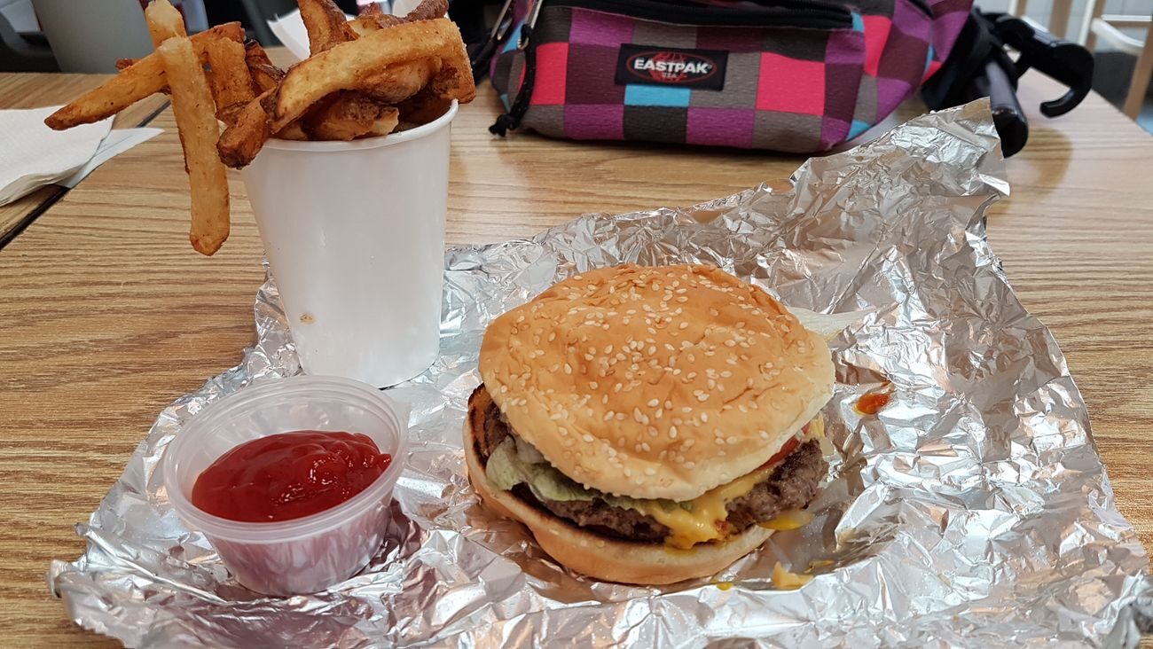 Una vez vistas todas estas casitas nos metemos por Montague St porque ya tenemos hambre y hemos visto en mi mapa que tenemos un Five Guys cerca. Tienen hamburguesas, sándwiches, perritos… Las hamburguesas las tienen pequeñas o normales, pero siempre refiriéndose a una o dos piezas de carne, el tamaño de la hamburguesa es siempre el mismo. Pedimos dos hamburguesas pequeñas (es decir, con una pieza de carne) con bacon y queso y una ración de patatas pequeñas por un total de 17,13$. En menos de cinco minutos ya tenemos el pedido listo. Las hamburguesas están deliciosas, me encantan, mucho mejores que las del Shake Shack, y la ración de patatas es enorme, nos sobra más de la mitad. Tiene baño. Comento lo del baño porque el guía del otro día Felipe nos explicó que en lugares con menos de “x” mesas (no recuerdo la cifra exacta, pero sobre cincuenta creo), no es obligatorio que tengan baño. Espero que repitamos este sitio antes de finalizar nuestro viaje.