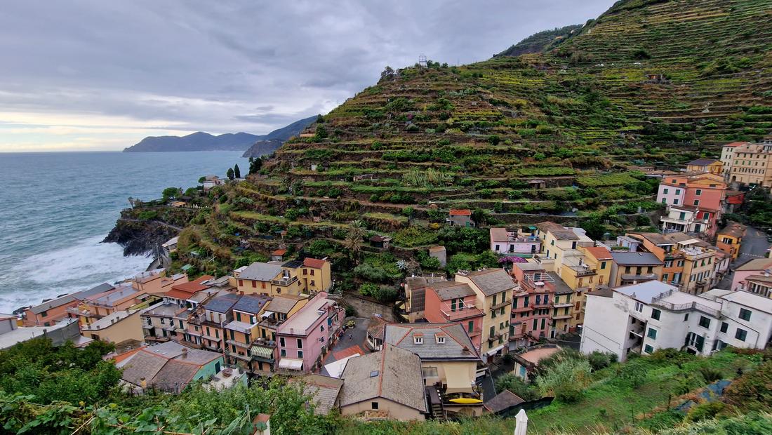 Descendemos por la vía Stazione hasta llegar a este punto, desde donde podemos contemplar Corniglia en toda su magnitud. Entre lo gris del día y que las casitas tienen la pintura bastante desconchada, no me ha parecido especialmente encantador…