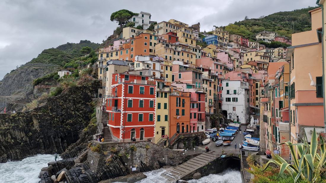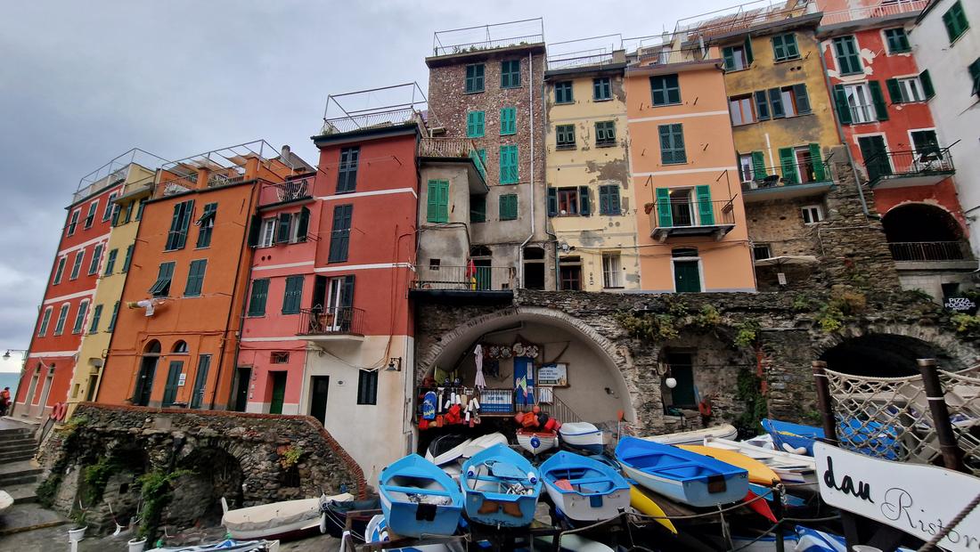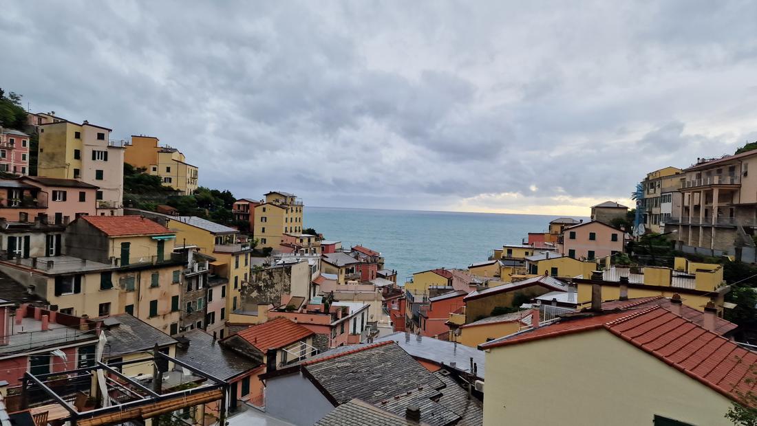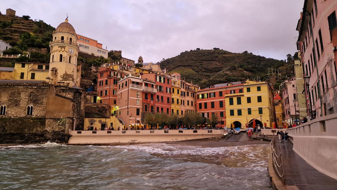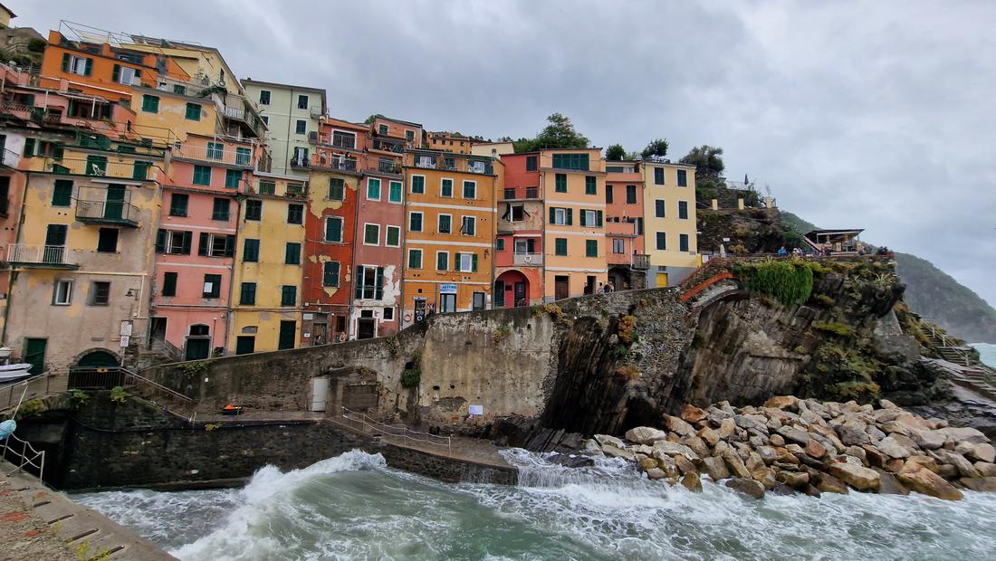 Descendemos hasta llegar al mar y recorremos todo el paseo litoral. Desde este punto obtenemos las mejores panorámicas de las preciosas y coloridas casitas escalonadas en la ladera. ¡Qué maravilla! Para mí es la imagen de postal que me venía a la cabeza cuando pensaba en las Cinque Terre. A pesar de que no deja de llover, el agua no puede enturbiar la belleza que desde aquí contemplamos.