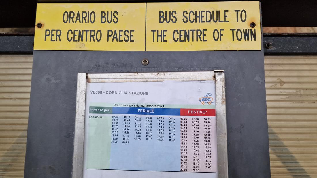 Salimos veloces del tren para ubicarnos de las primeras en la marquesina del autobús ubicada junto a la salida de la estación. He leído que es importante ponerse rápido en la cola puesto que el autobús que nos subirá al centro es mini, con solo ocho asientos. Este bus nos permite esquivar (al menos a la ida) la Lardarina, una escalera de ladrillo rojo que conecta la estación con el pueblo, tras trescientos ochenta y dos escalones y treinta y tres rampas. El billete del minibús está incluido en la Cinque Terre Card. Si no poseéis la tarjeta, el precio es de 3€ (ida y vuelta). OJO porque el bus no te recoge en la propia marquesina, sino justo enfrente, donde hay unas líneas amarillas pintadas en el suelo que ponen “bus”.