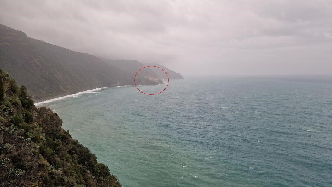 Ha empezado a llover, el mar está muy agitado y una especie de neblina dificulta un poco las vistas. A pesar de ello, el gigante sujetando la cornisa me resulta de lo más llamativo.
