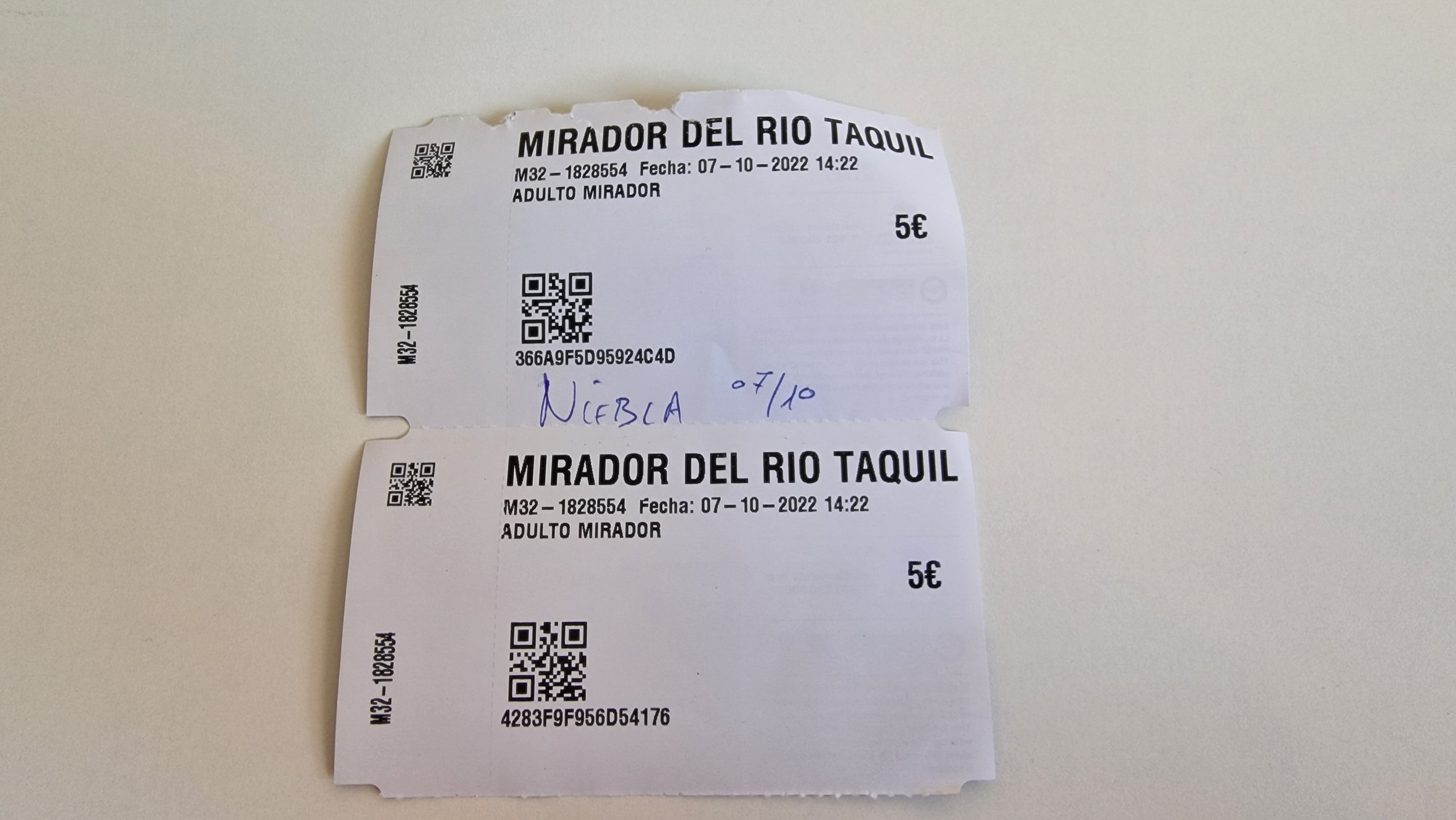 Al comprar las entradas en la taquilla nos indican que al haber bruma los tickets pasan a tener una validez de una semana por si queremos repetir la visita. Para ello nos hacen una anotación a bolígrafo en las entradas. Nos indican que lo mejor es llamar previamente por teléfono al mirador para que ellos nos informen sobre si hay visibilidad o no.