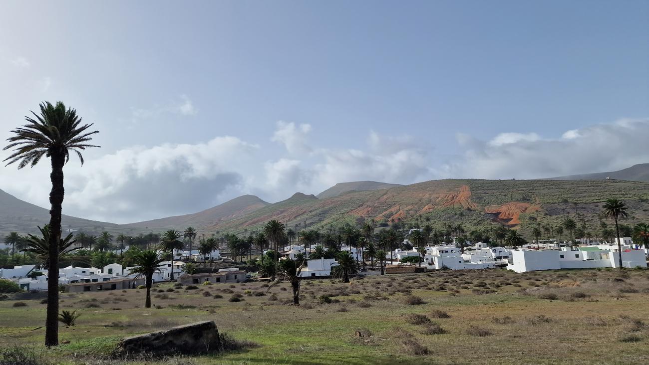 Llegamos al pueblo de Haría a las 16 horas. Tenía grandes expectativas con esta visita pues había leído que: “conocido como el pueblo de las mil palmeras puesto que antiguamente se plantaba una palmera por cada niña que nacía y dos por cada niño, se trata de una villa llena de verdor, como nunca verás en este lugar. Haría, lugar de exuberante vegetación, un oasis sin igual. La tranquilidad que se respira en esta pequeña y hermosa villa, nos invita a sentarnos en las plazas, a disfrutar del agradable clima y del sonido que producen, por el viento, las cientos de palmeras sembradas en el poblado y en todo el valle que le rodea. La sensación de estar en un paraíso tropical se remata con las casas blancas y con el color oscuro que queda en las tierras, tomadas por la actividad volcánica que aquí se generó siglos atrás“.