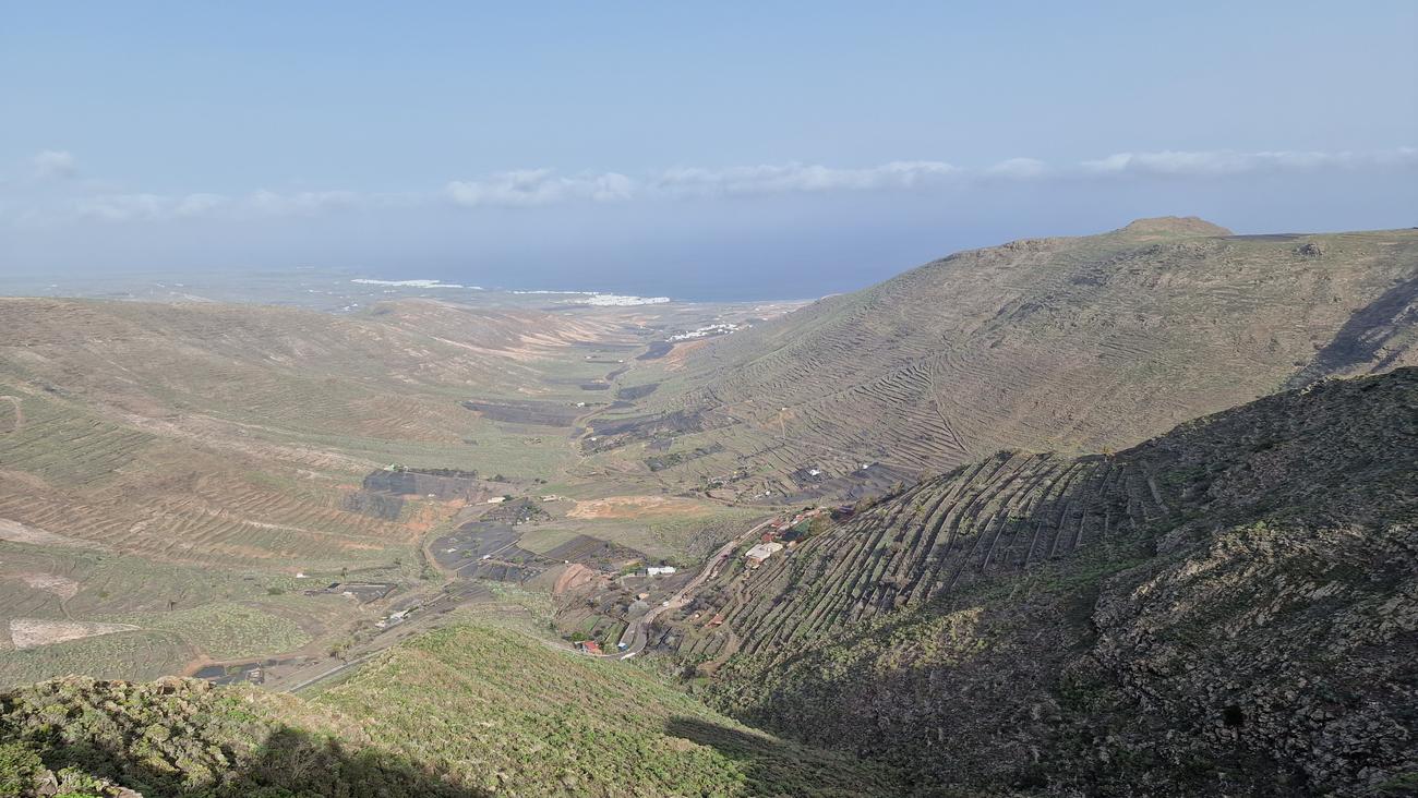 Subimos por una estrecha carretera de montaña con curvas cerradísimas. Por el camino hacemos una parada en un apartadero para contemplar el valle de Haría y su palmeral.