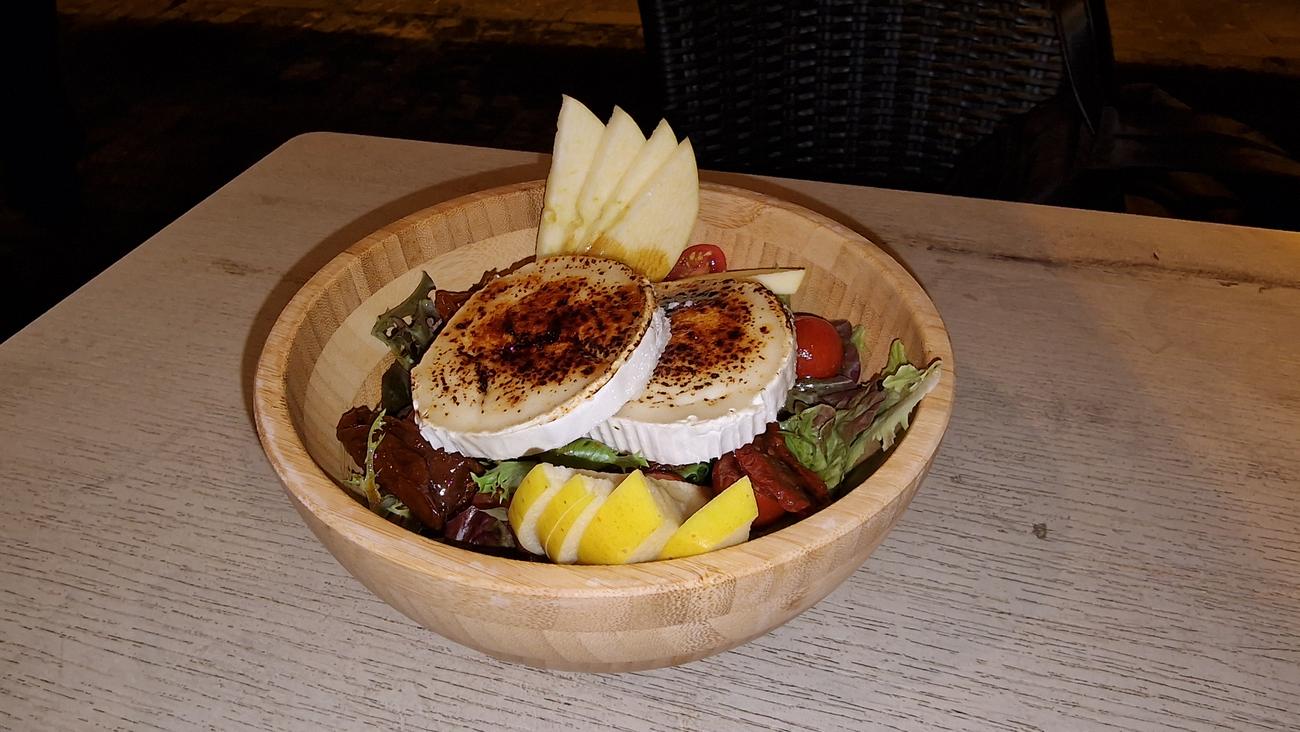 - Una ensalada de queso de rulo caramelizado con almendra tostada, tomate seco, manzana, cherry y aderezo de soja y miel de caña.