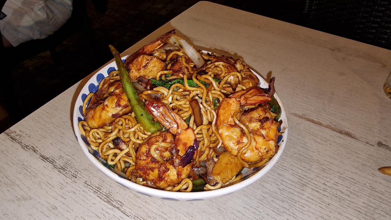 - Un wok “tierra y mar” con pollo de corral y langostinos.