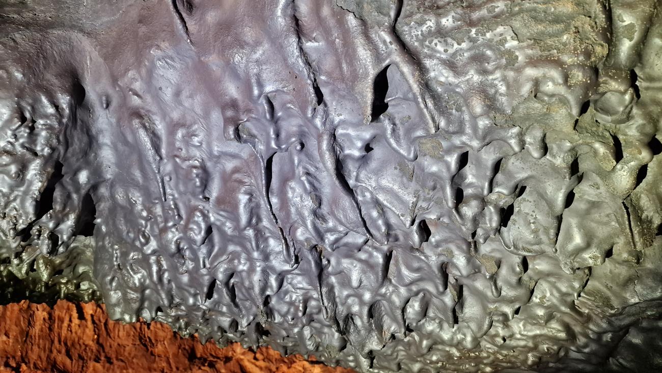 - Veremos ciertas formaciones que nos recordarán a las estalactitas, pero en el interior de la cueva no hay filtraciones de agua por lo que no hay ni estalactitas ni estalagmitas. Son los estafilitos, formados por goteos de lava que parecen chocolate derretido.