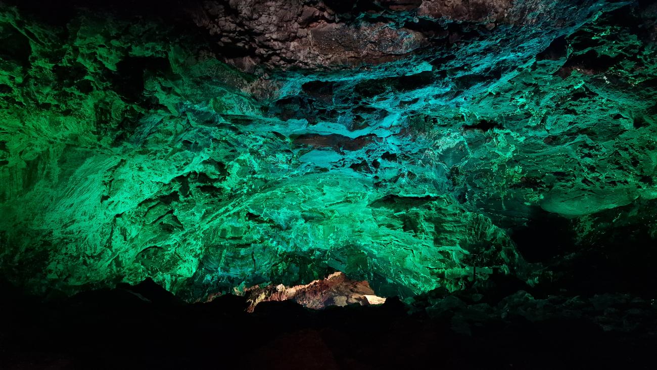 “Al igual que los Jameos del Agua, la Cueva de los Verdes es parte de un tubo volcánico generado tras la erupción del volcán de la Corona, hace unos cuatro mil años. La parte submarina de este tubo es conocida como el túnel de la Atlántida, uno de los túneles volcánicos más relevantes del mundo. Utilizada como refugio de la población frente a los piratas berberiscos del norte de África durante los siglos XVI y XVII, se dice que la Cueva de los Verdes debe su nombre al apellido de una familia que usaba la cueva y guardaba su ganado en los alrededores. En los años sesenta el Cabildo de Lanzarote encarga la adecuación de la cueva a Jesús Soto, quien luego se convertiría en colaborador de César Manrique. Respetando el entorno natural, la mano del hombre se limita a acondicionar el sendero que nos conduce a través de la cueva así como a introducir la luz y el sonido ambiental“.