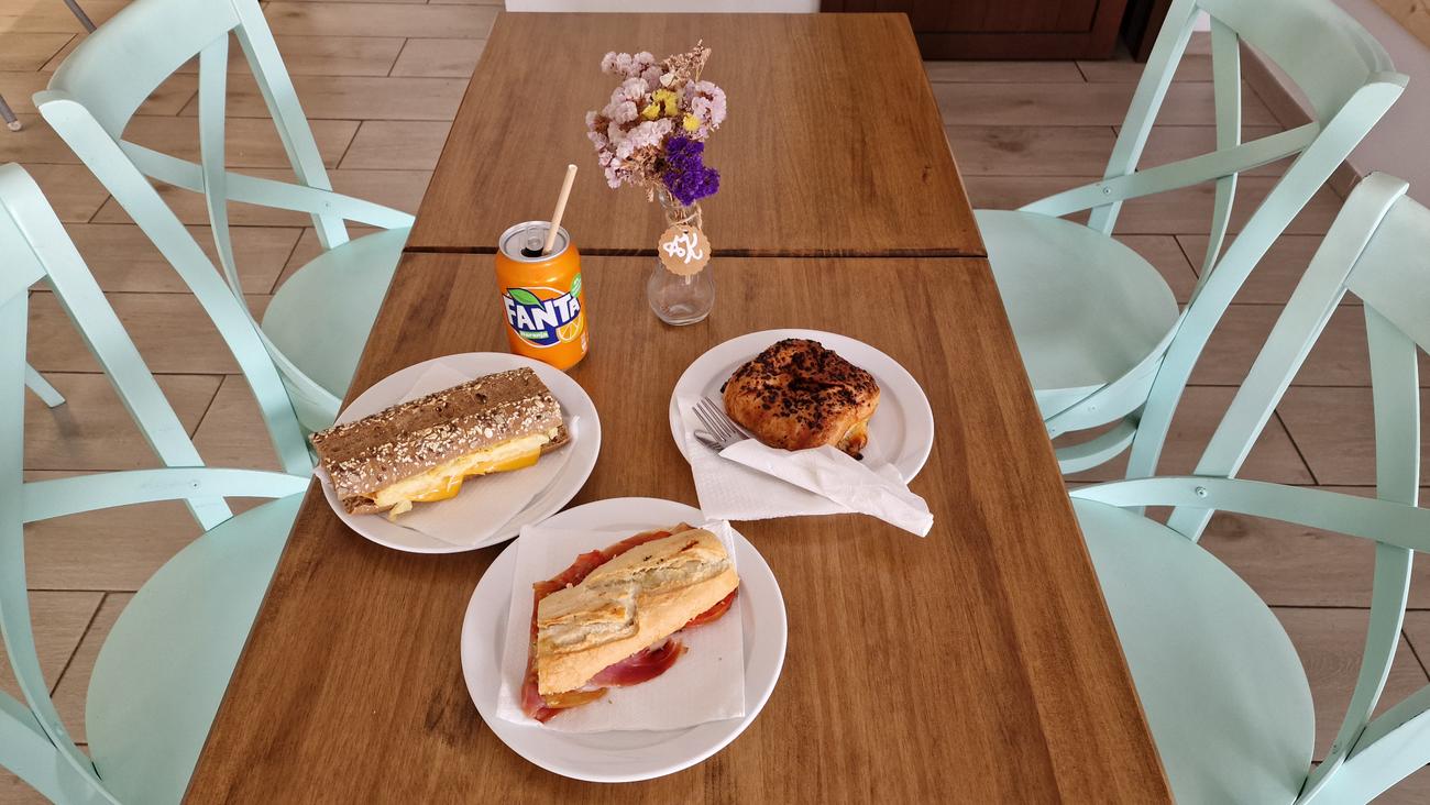 Antes de iniciar el recorrido decidimos reponer fuerzas en la bocatería AK Abuela Katalina. Tomamos dos consumiciones, dos bocadillos y una napolitana por solo 8,60€. Todo estaba muy rico y el personal ha sido muy amable, así que os lo recomiendo. (En 2025 el mismo local se llamaba Bocatería El Norte, abren a las seis de la mañana, lo que es un puntazo si tenéis que madrugar, y me pareció igual de recomendable. También en el Minimarket ubicado justo al lado venden bocadillos preparados, para un posible picnic)