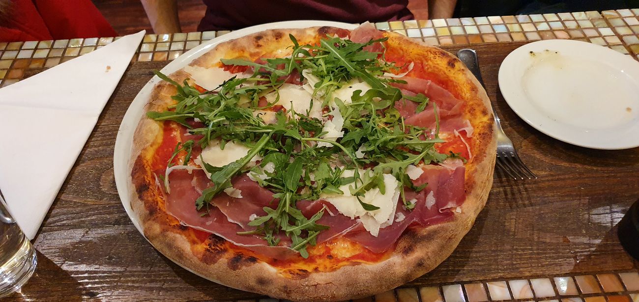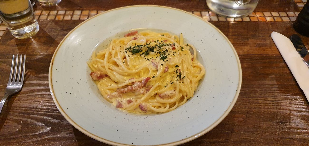 Después de tanta adrenalina gastada vamos directos a reponer fuerzas al restaurante italiano Amici Miei. Hemos reservado sin problema para seis personas con solo treinta minutos de antelación. Mi chico y yo pedimos para compartir unos linguini a la carbonara y una pizza canasta.