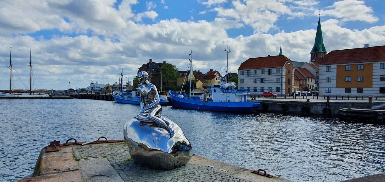 Encontramos una llamativa estatua plateada que a lo lejos nos parece una réplica de la Sirenita de Copenhague. Una vez que nos acercamos, descubrimos que se trata de la figura de un hombre desnudo.