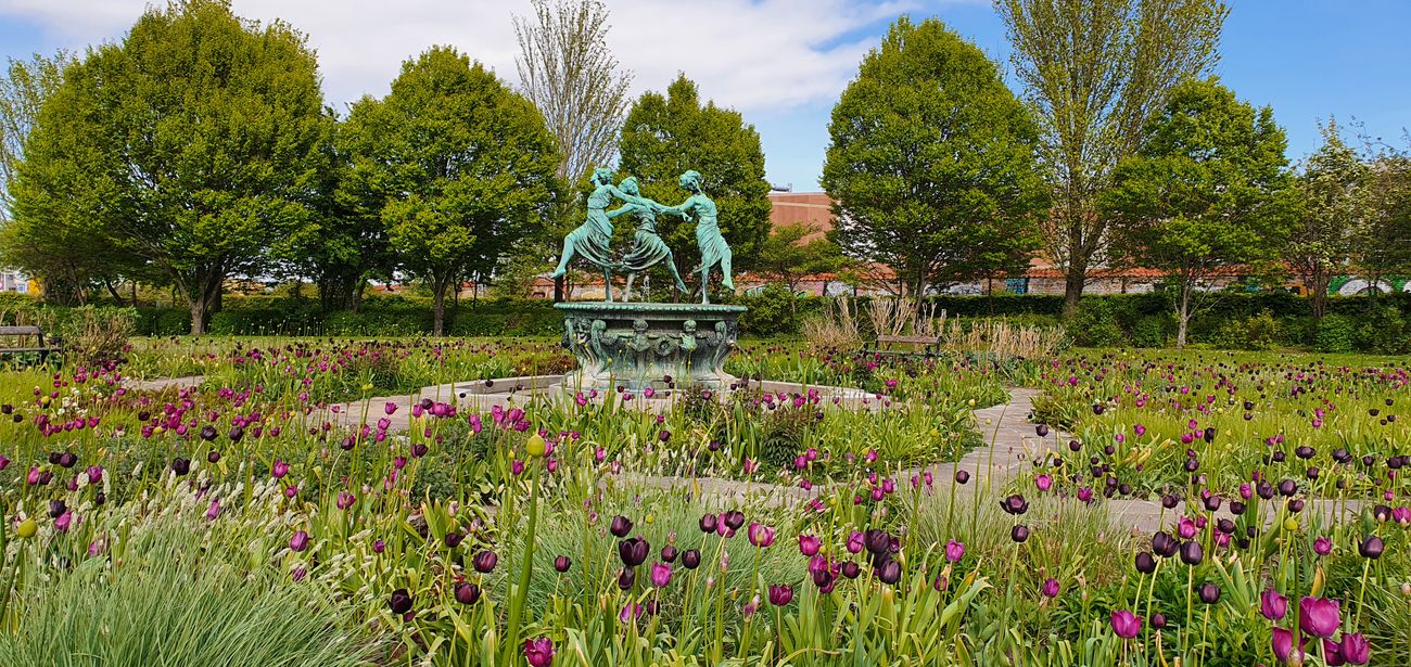 La última visita que hacemos es la que más me gusta de todas. Descubrimos la “dancer’s fountain“, que me deja totalmente enamorada. La escultura de tres bailarines con un maravilloso campo de tulipanes alrededor me parece un rincón perfecto para sentarse y simplemente disfrutar. ¡¡Qué lugar tan maravilloso con todos estos preciosos tulipanes!!