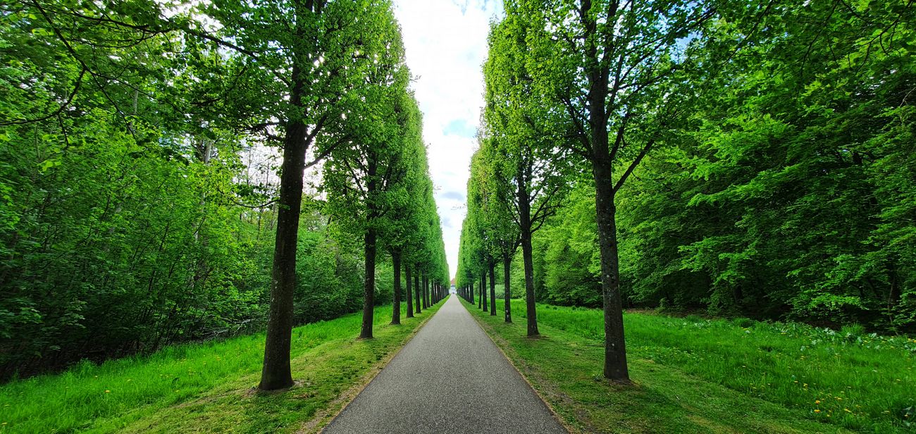 Así que damos media vuelta y empezamos el recorrido por los jardines. Aunque más que jardines nos encontramos con un largo pasillo con árboles plantados de manera simétrica, lo que hace las delicias de alguien tan cuadriculada como yo.