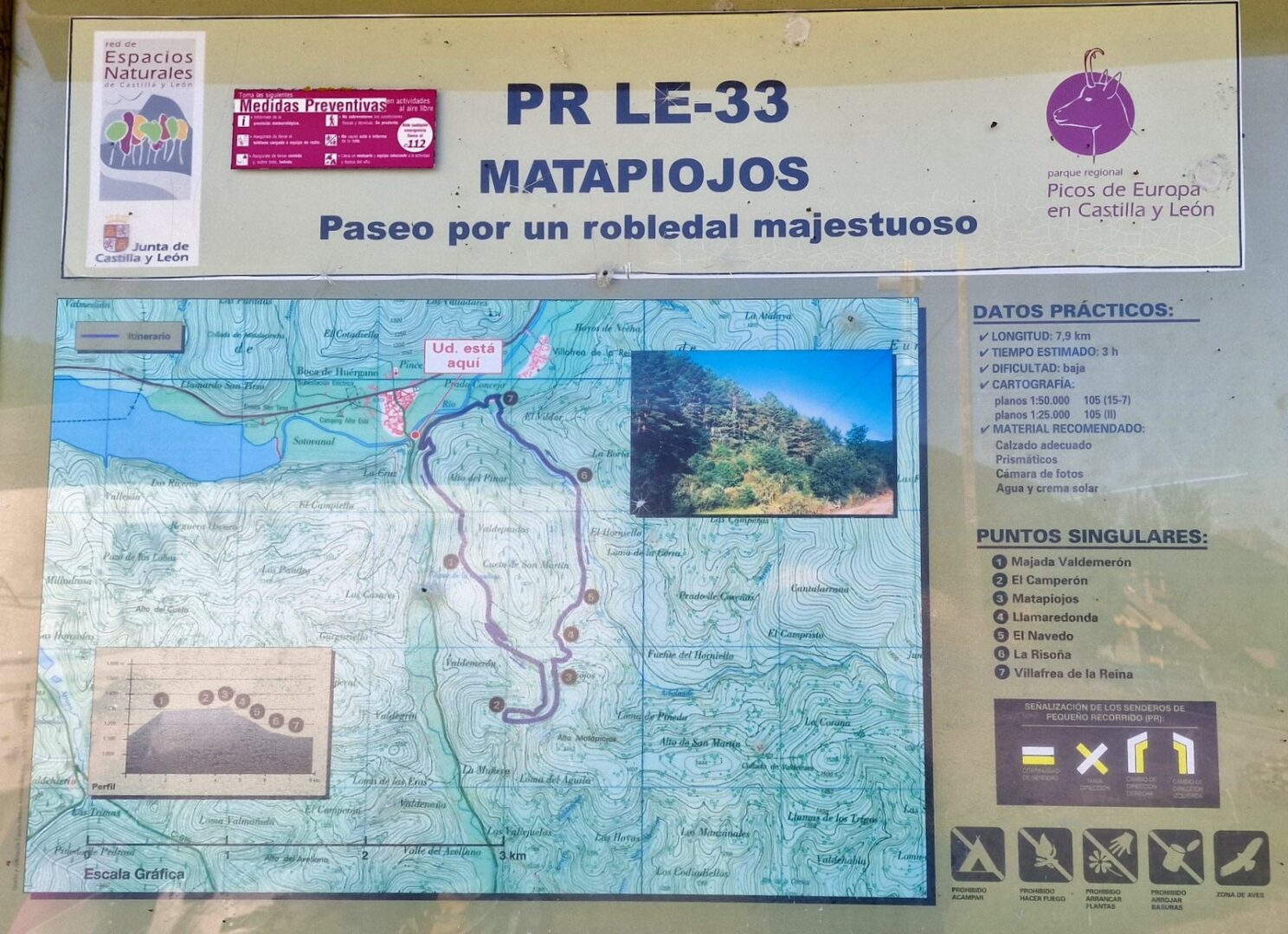 Iniciamos la aventura a las 10.30 horas. La pista que debemos seguir sale justo detrás del parking en el que hemos estacionado. Al principio de la misma encontramos el panel informativo de Matapiojos.