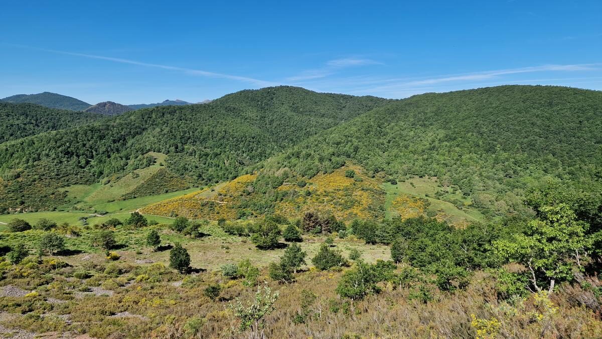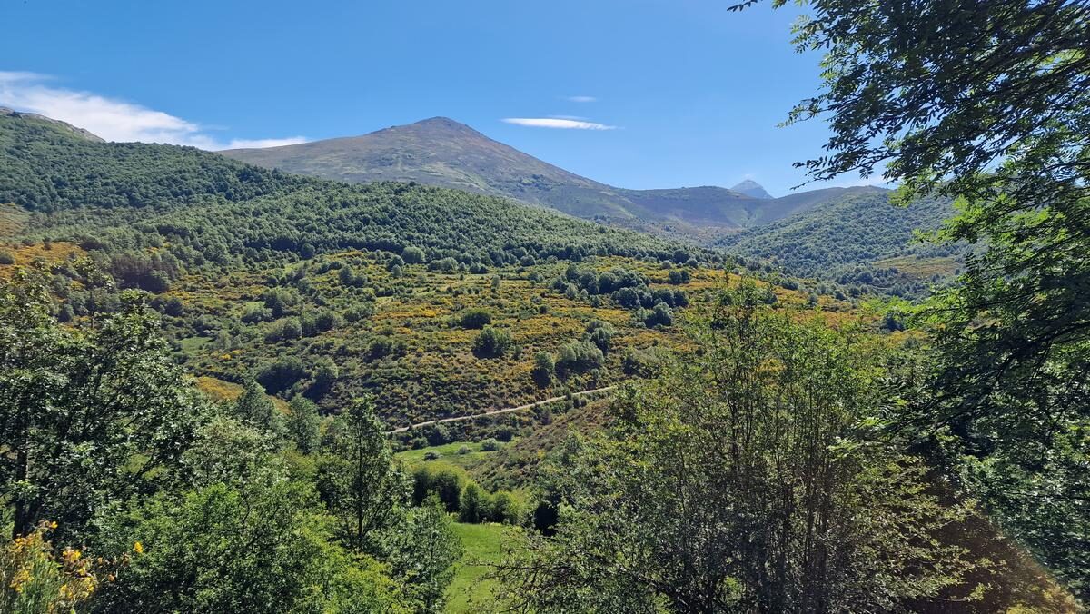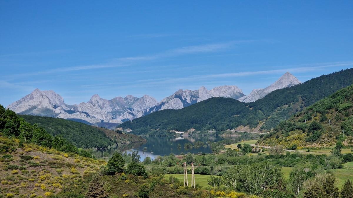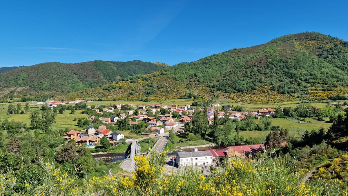 Las preciosas florecillas amarillas denominadas piornal nos acompañan en nuestro camino. Da gusto lo verde intenso que se ve todo. A mano derecha vamos dejando atrás el pueblo de Boca de Huérgano y, un poco más lejos, podemos apreciar la cola del embalse de Riaño.