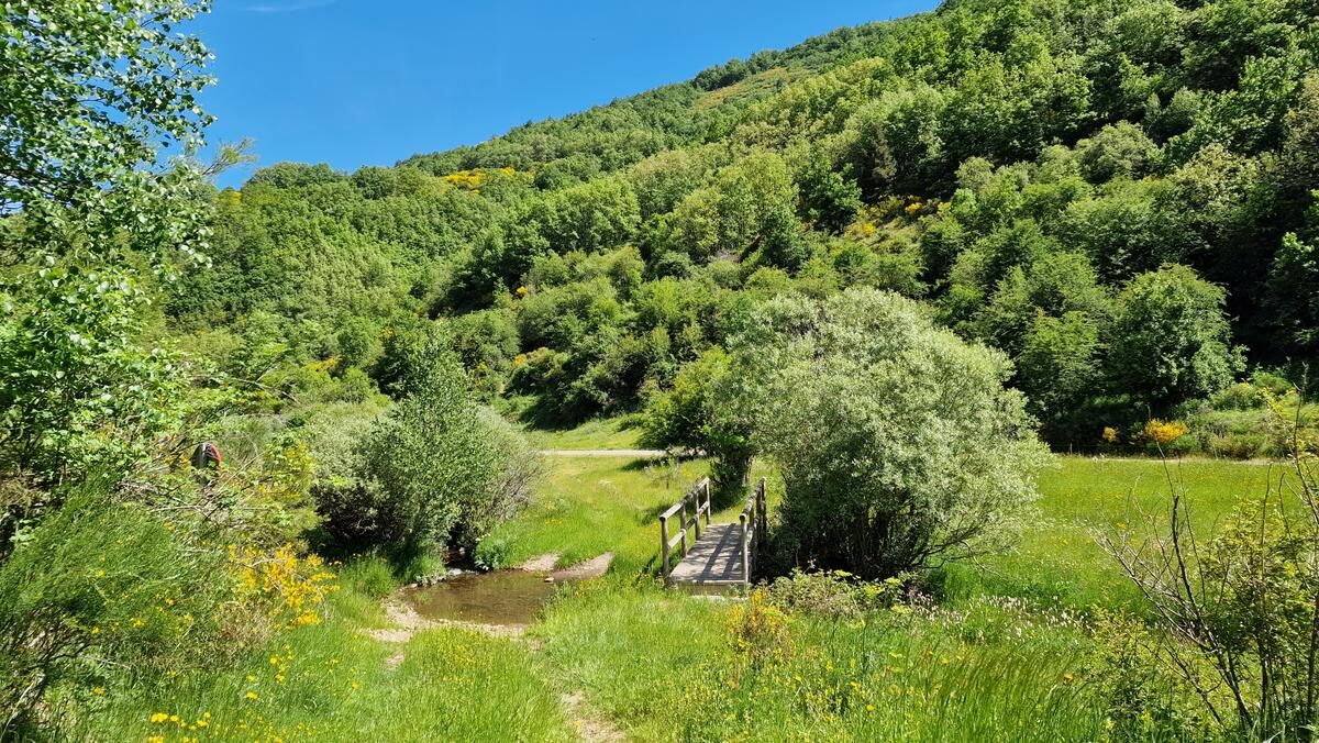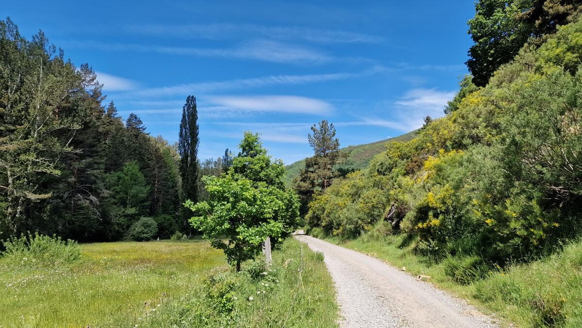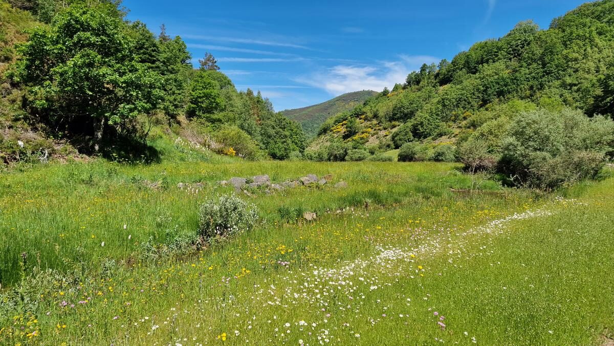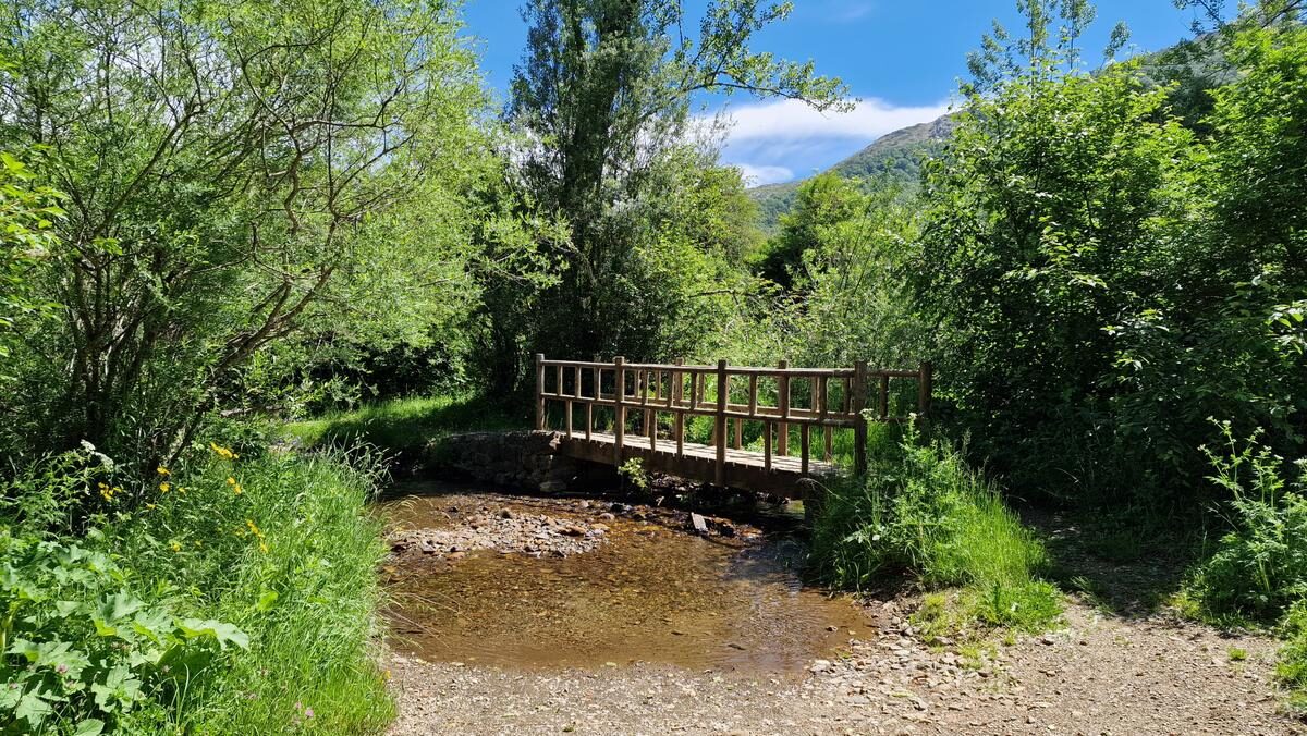 Una vez que dejamos atrás el bosque, después de 5,5 kilómetros de recorrido, atravesamos un primer puente de madera y llegamos a una preciosa hondonada con una pradera salpicada de florecillas silvestres, amenizada con el rumor del agua del riachuelo. Este tramo, que comprende los dos últimos kilómetros de la ruta, me gusta mucho más a pesar de que vamos caminando por una ancha pista forestal que le resta bastante encanto a la travesía por el valle.