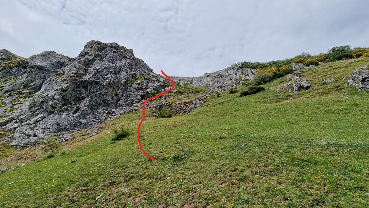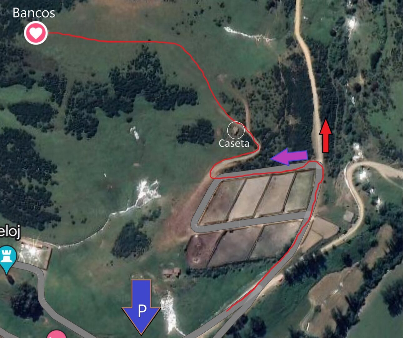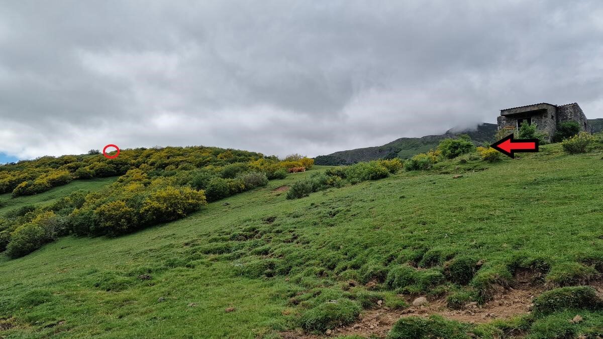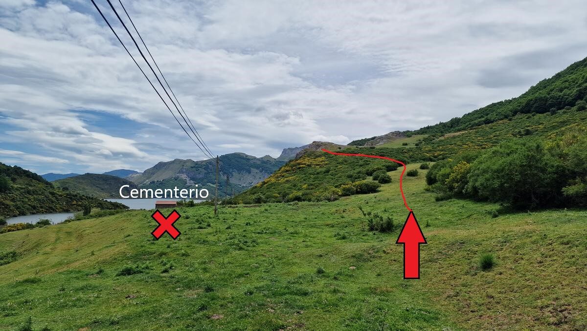 - Hice una segunda ida y vuelta por el sendero correcto, tras dejar el cementerio bastante a la izquierda, subiendo por la pradera de la derecha, que es el que debéis seguir para llegar al banco con total facilidad. Sin el track es un poco difícil encontrar el camino adecuado puesto que es un tramo que han ido abriendo las vacas entre la maleza y todos los alrededores están muy cerrados por los arbustos, impidiendo el paso. En mi caso, después de un par de equivocaciones y gracias a la vista satélite de Wikiloc por fin encontré el sendero que sale, “muy entre comillas”, a la izquierda de un abrevadero de vacas. Si seguís mi track y mis indicaciones no tendréis pérdida ninguna, creo, jajajaja.