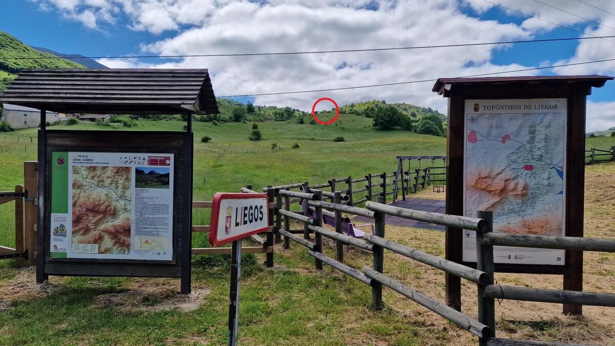 Luego os recomiendo que recorráis con vuestro vehículo los quinientos metros que os separan del aparcamiento oficial. En nuestro caso, a mediados de junio, todavía no habían segado por lo que nos encontramos con un prado de altas hierbas en el que estacionar siguiendo una gran señal de “aparcamiento”. Desde el propio parking y sabiendo dónde se encuentra, ya se puede observar “el banco más bonito de Liegos”, a lo lejos.