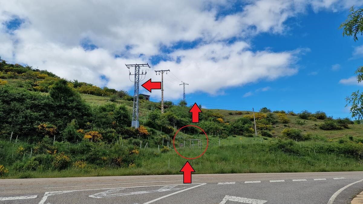 Es necesario cruzar la carretera general en dirección a tres torres de alta tensión junto a las que se encuentra un cercado para evitar el paso de ganado, que debéis sortear.