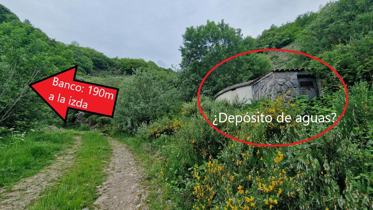 Una vez recorrida la parte superior del cercado toca ascender ladera arriba un poco por donde mejor te cuadre, puesto que solo encontramos una señal en la misma subida, sobre una caseta de piedra, que nos indica que los bancos se encuentran a ciento setenta y cinco metros a la izquierda.