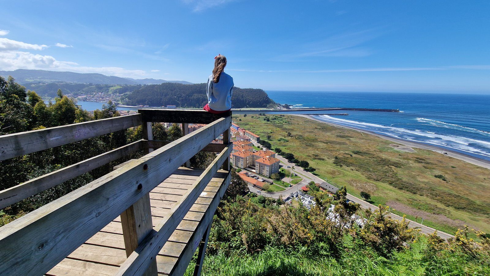 Si recorrer las trincheras es algo curioso de hacer, la ubicación de las mismas es una visita obligatoria, pues un coqueto mirador en madera se extiende sobre San Juan de la Arena. Las vistas son absolutamente increíbles e imprescindibles. Si bien es cierto que los eucaliptos tapan más de lo me gustaría la visión de San Esteban de Pravia, el conjunto de la desembocadura del río Nalón fundiéndose en el mar Cantábrico junto al larguísimo playón de Bayas, que contemplábamos antes desde las alturas, me dejó completamente boquiabierta.