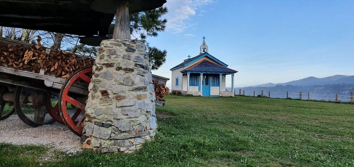 Henchidos de felicidad nos dirigimos al segundo mirador del día. Aparcamos junto a la iglesia parroquial de Santiago de Ranón. En la misma iglesia ya encontramos un cartel que nos indica “Patrimonio Militar – Fortificaciones Guerra Civil – Seiscientos metros”. Como no sabía si todo el recorrido iba a estar bien señalizado, decidí grabar un track con Wikiloc. Luego descubrimos que estaba todo perfectamente indicado y que no tiene pérdida ninguna.